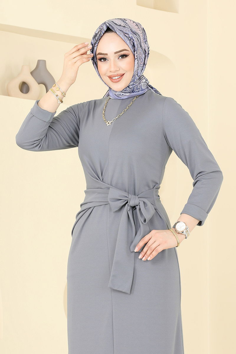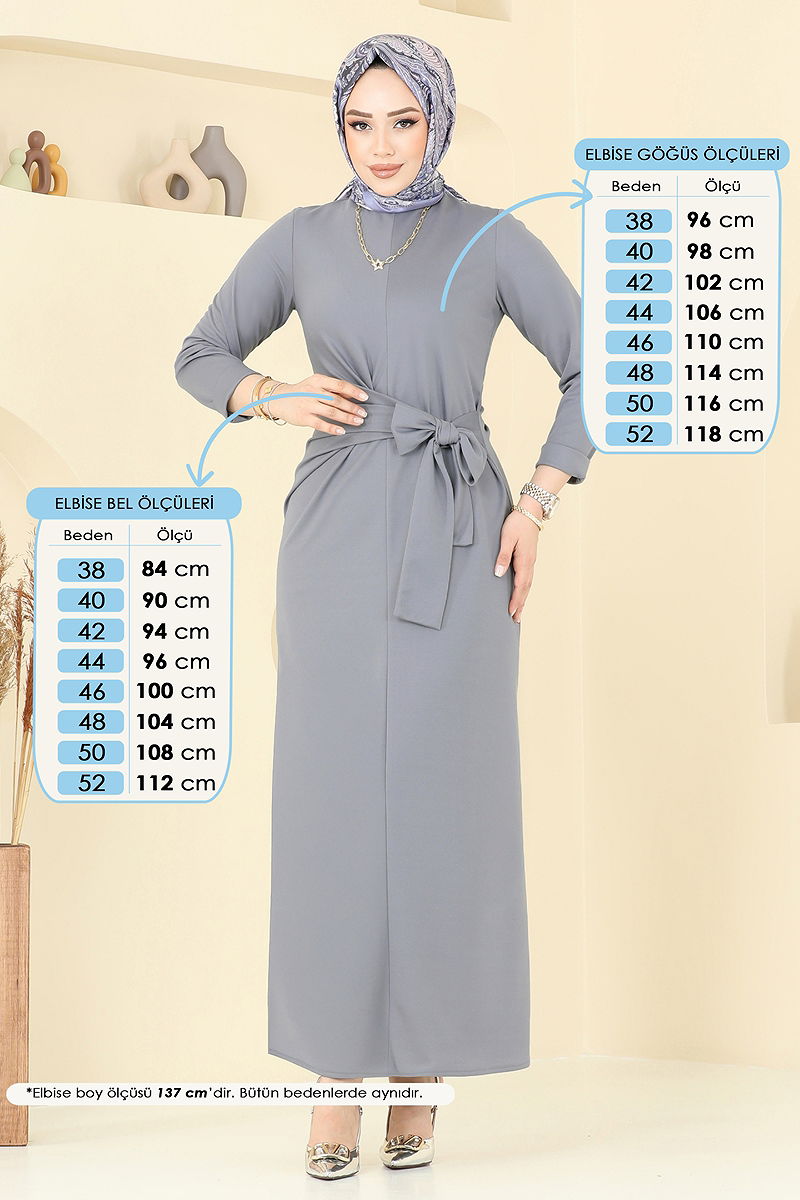 The Side-Tie Hijab Dress is versatile enough to wear in any season. Its machine washable at 30 degrees on a delicate cycle, making it convenient for everyday use. Made from Scuba Crepe fabric, it is both durable and comfortable. The half mandarin collar and back zipper design offer a modern look while the adjustable side tie belt accommodates various body shapes. The model's measurements are height 165 cm, bust 88 cm, waist 68 cm, hips 99 cm, weight 56 kg. Note: Accessories are not included.