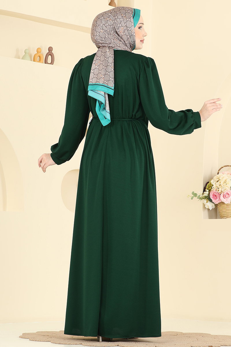 Elegant and stylish, the Brooch Accessorized Belted Dress is a modest fashion item suitable for all seasons. Easy to care for with its 30-degree delicate wash capability, this dress is made from knitted crepe fabric and offers long-lasting wear. The bike neck and zipper at the back provide a contemporary look, while the different size options make it accessible for everyone. The belt and brooch details are optionally usable, allowing for versatility in style.