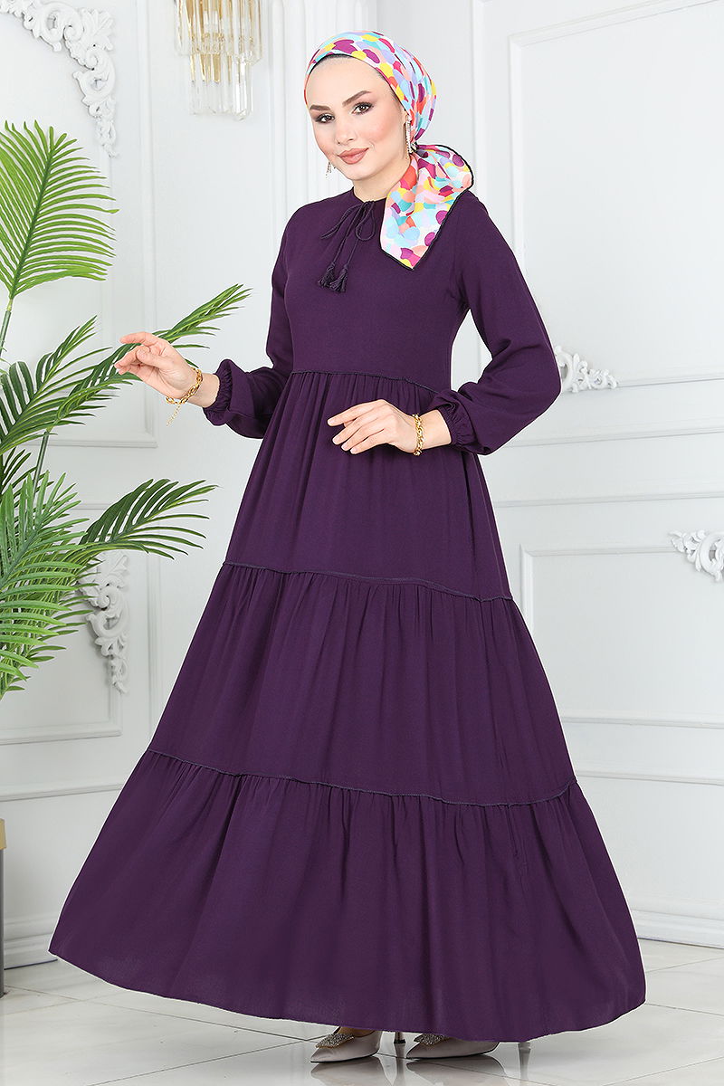 The Tie-Neck Viscose Dress is a specially designed modest wear product. Suitable for use in spring and summer, this dress is made from breathable viscose fabric. It features a bike neck and elasticated cuffs for a modern look. The dress is unlined, making it light and convenient to wear. Hand washing is recommended. Model dimensions: Height: 160 cm, Chest: 86 cm, Waist: 68 cm, Hips: 95 cm, Weight: 55 kg. Ideal for those looking for stylish and comfortable options.