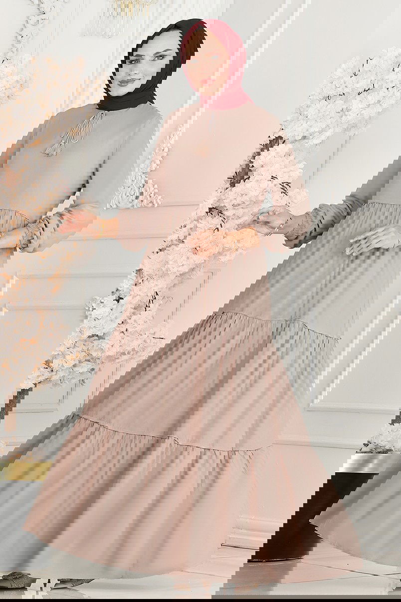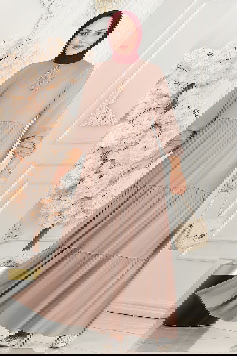 The Tie-Neck Viscose Dress is a specially designed modest wear product. Suitable for use in spring and summer, this dress is made from breathable viscose fabric. It features a bike neck and elasticated cuffs for a modern look. The dress is unlined, making it light and convenient to wear. Hand washing is recommended. Model dimensions: Height: 160 cm, Chest: 86 cm, Waist: 68 cm, Hips: 95 cm, Weight: 55 kg. Ideal for those looking for stylish and comfortable options.