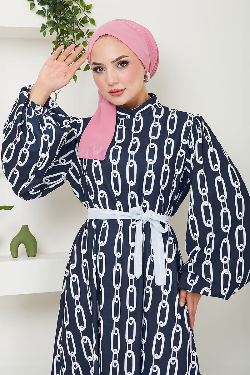 Chain Pattern Crepe Dress is a hijab dress model. It can be worn in all four seasons without squeezing at 30 degrees. It is made of first class Crepe fabric. The product has a Mandarin collar and is unlined. The product has a side zipper. Height: 170 cm, Chest: 90 cm, Waist: 70 cm, Hips: 99 cm, Weight: 50 kg. To prevent the belt from fluttering, the ends are stitched and the middle part is left empty (seamless). The belt is included in the product and can be optionally used.