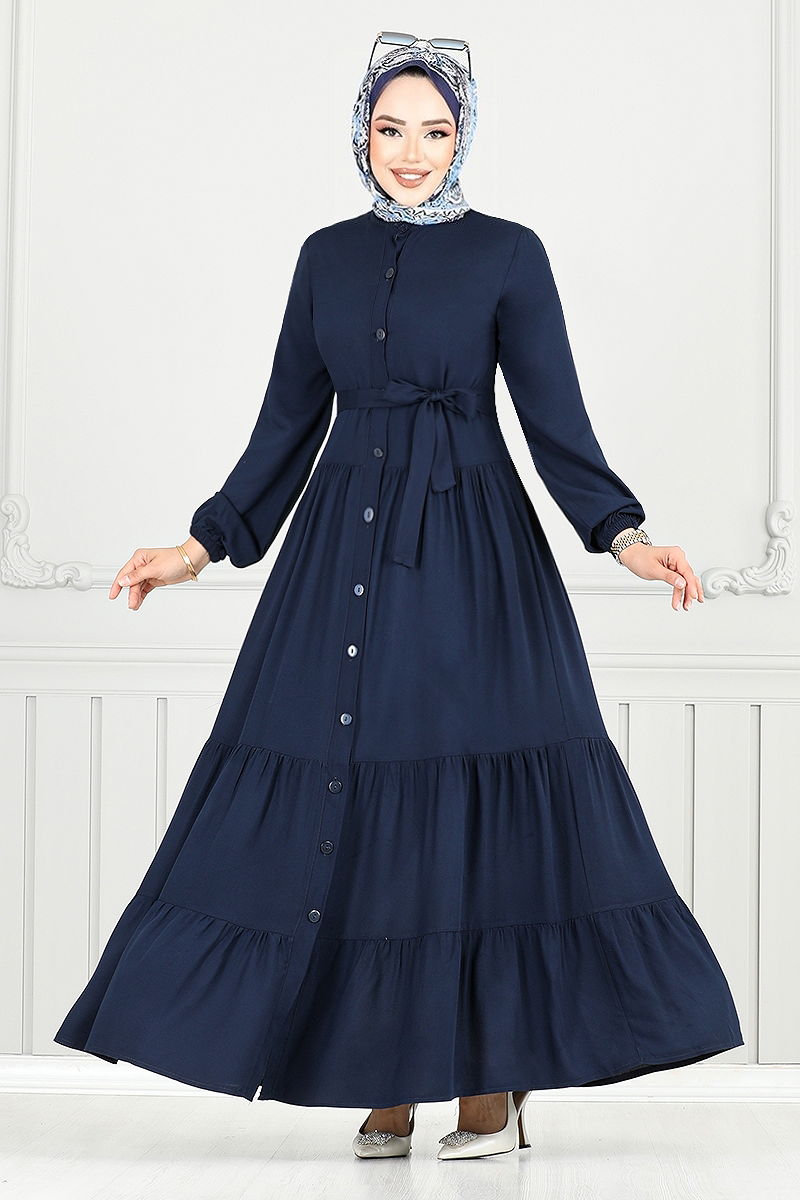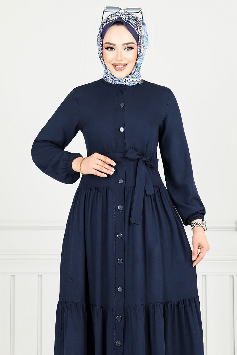 This viscose dress is a modest wear model that can be comfortably used in all seasons. It should be hand washed and offers a light feel with its lining-free design. The half-mandarin collar and button-front design add an elegant touch. The included belt can be worn optionally. The elastic cuffs provide a comfortable fit, while the stylish wavy belt catches the eye. The sample shown is a size 38. An ideal choice for both comfort and elegance!