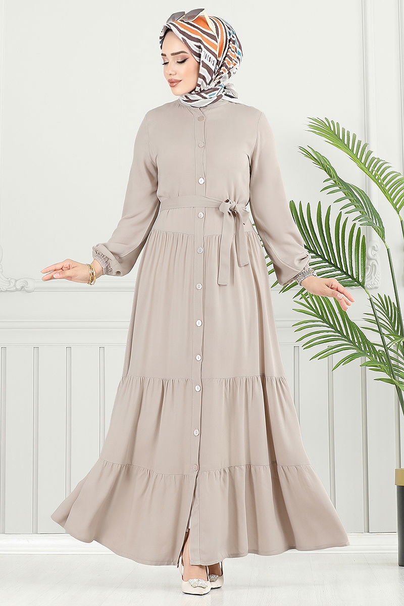 المنتج لديه ياقة نصف بيضوية. المنتج به أزرار من الأمام. غير مبطنة. الحزام متضمن، ،يمكن استخدامها حسب الرغبة السوار مطاطي. قد يكون هناك اختلاف في الدرجة اللونية في المنتج بسبب التقاط الصور الفوتوغرافية.