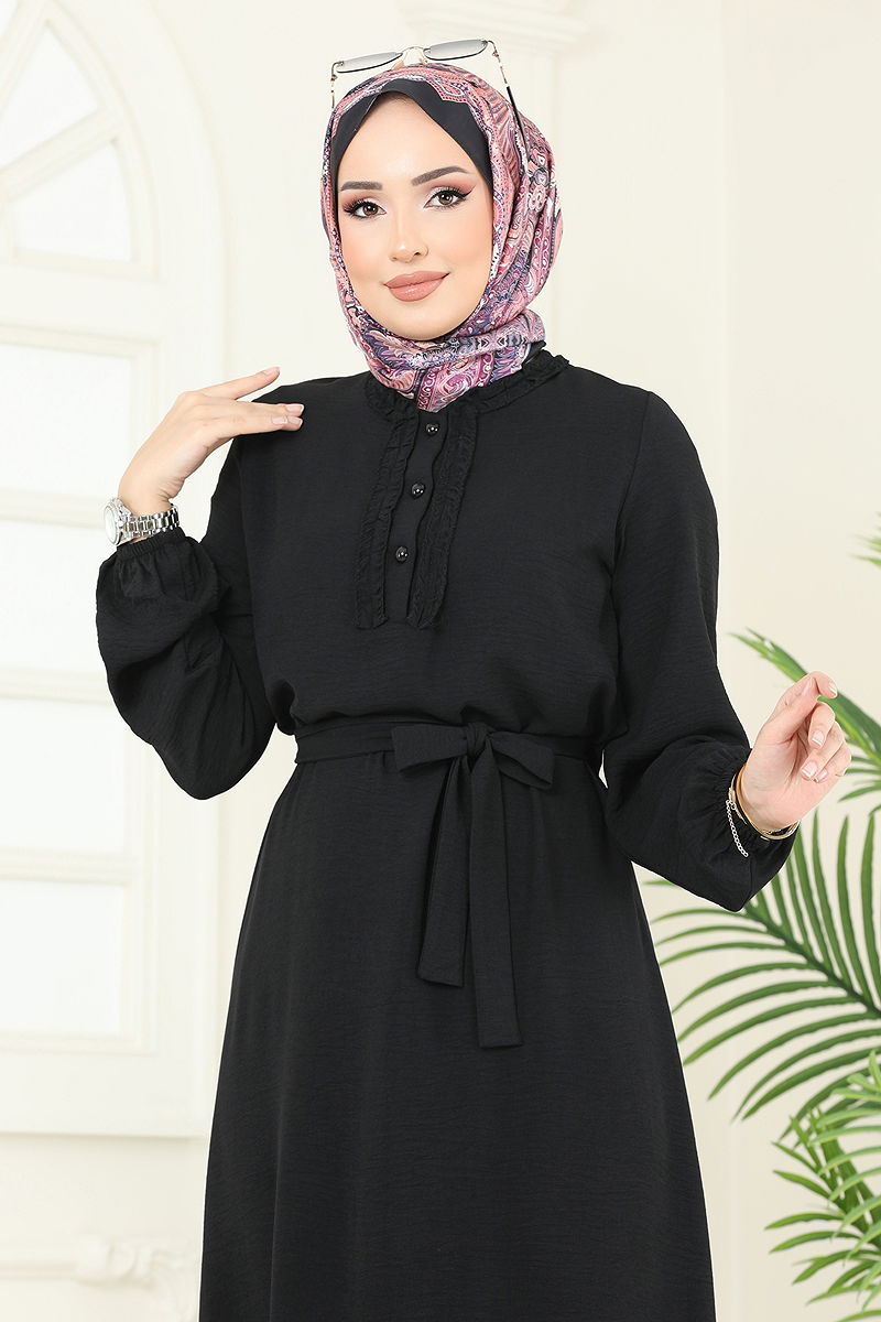 المنتج لديه ياقة دائرية. المنتج به أزرار نصف أمامي. غير مبطنة. الحزام متضمن، ،يمكن استخدامها حسب الرغبة السوار مطاطي. قد يكون هناك اختلاف في الدرجة اللونية في المنتج بسبب التقاط الصور الفوتوغرافية.