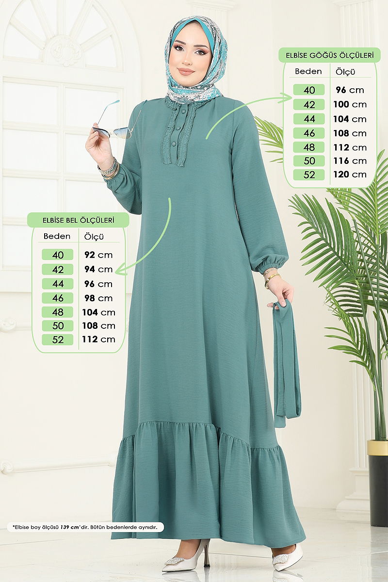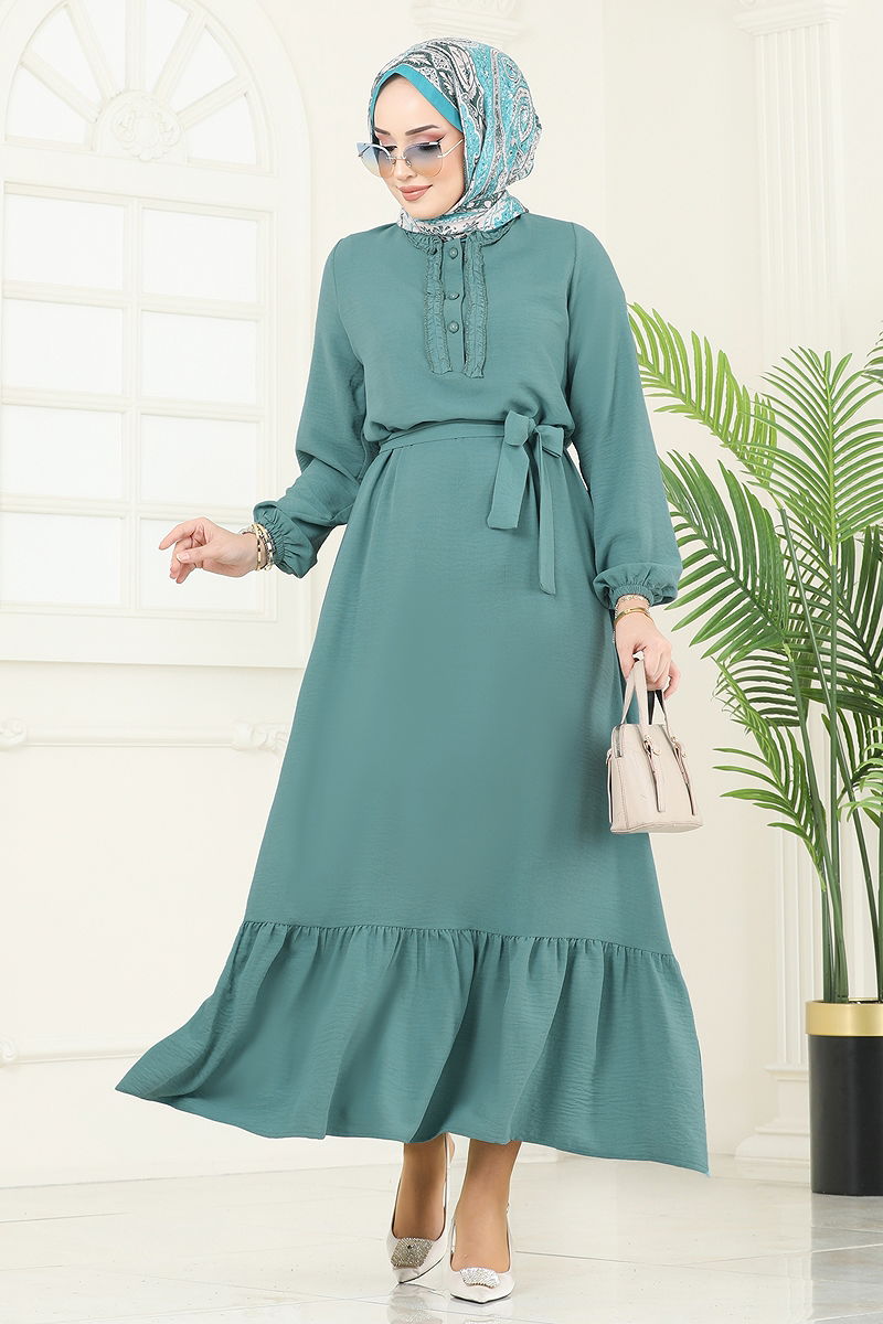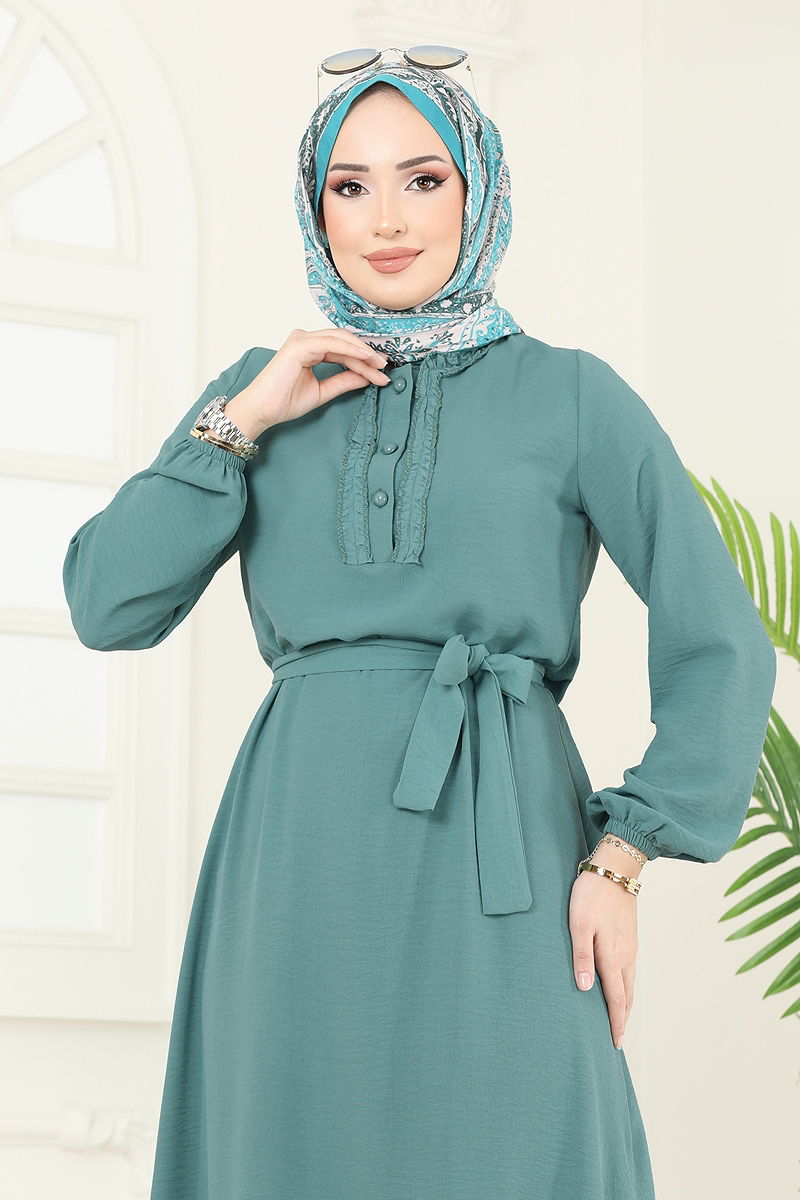 Elegant and modern, the Ruffled Front Modest Dress ensures you maintain your style in any setting throughout all seasons. Made from Aerobin fabric, this dress offers lightweight and breathable comfort all day long. Its mock-neck and half-button front provide practicality, while the elastic cuffs and included optional belt offer varied styling options. It can be washed at 30 degrees with a gentle cycle.