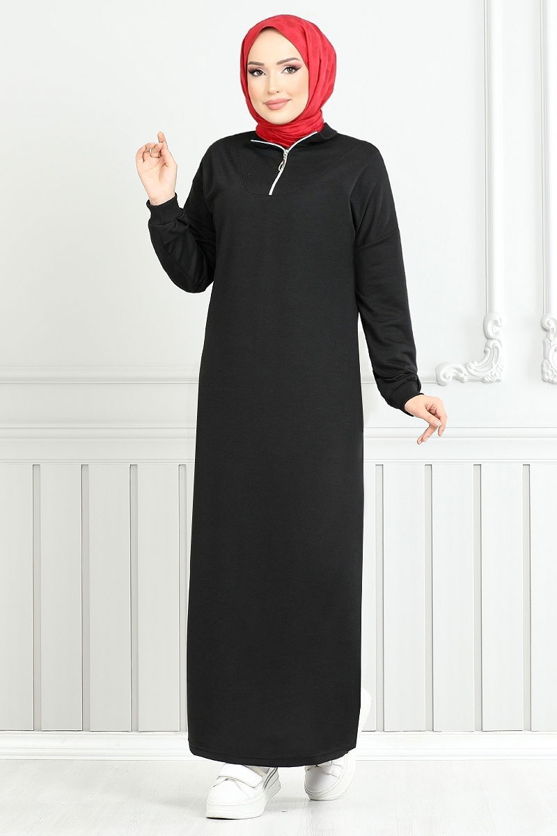 Offering both style and comfort, the Zip Front Sporty Dress can be worn in all seasons. Made from dual-thread fabric, this modest dress can be washed at 30 degrees on a delicate cycle. It features a stand collar and is unlined. The size 38 on the model serves as an example, and its practical half-zip front makes it easy to wear.