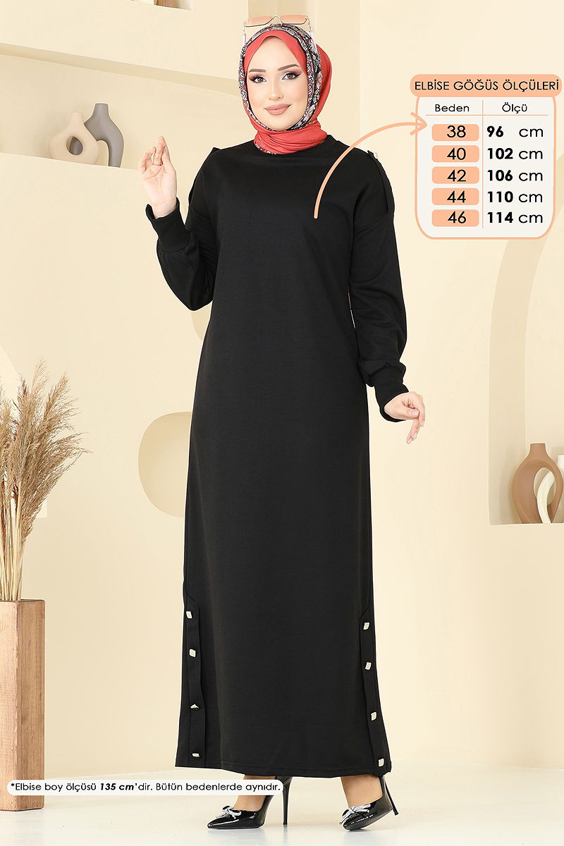 The Shoulder Button Dress is a distinguished choice among modest wear. Suitable for all four seasons, this item can be washed at 30 degrees under delicate conditions. Made from dual-thread fabric, the dress features a Mandarin collar and is unlined. Displayed model is in size 38, but note that buttons are purely decorative. Cuff buttons are functional.