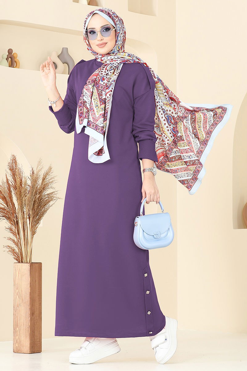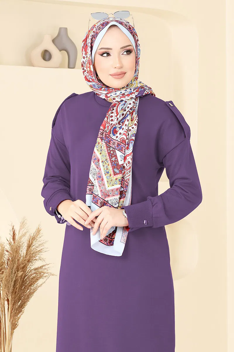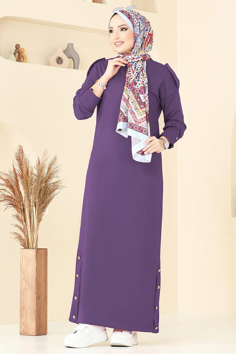The Shoulder Button Dress is a distinguished choice among modest wear. Suitable for all four seasons, this item can be washed at 30 degrees under delicate conditions. Made from dual-thread fabric, the dress features a Mandarin collar and is unlined. Displayed model is in size 38, but note that buttons are purely decorative. Cuff buttons are functional.