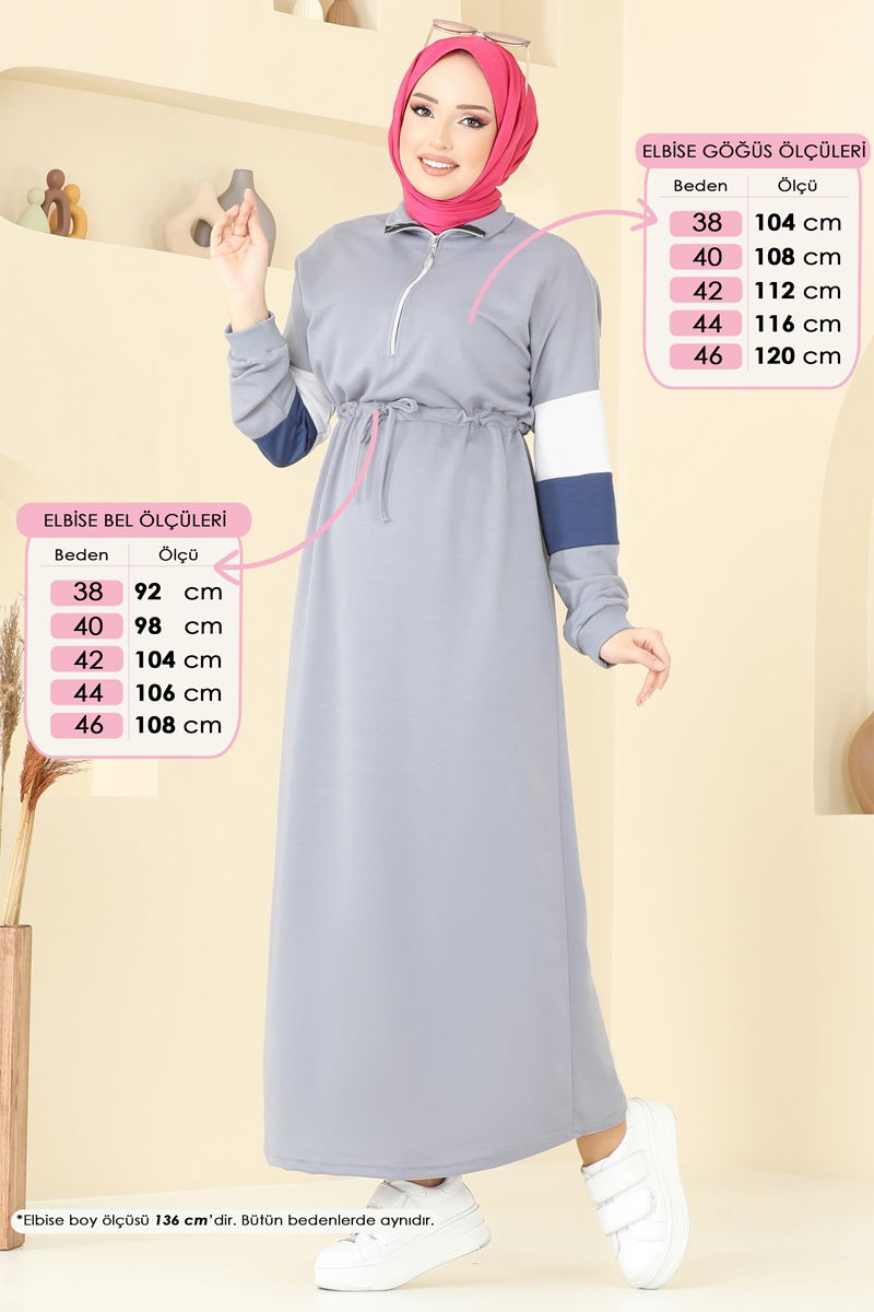 The Half-Zip Dress is an ideal choice for modest wear, suitable for all seasons. It is recommended to be washed delicately at 30 degrees Celsius. The stand-up collar design and unlined structure offer comfort. The active half-zip detail on the garment ensures easy use and a stylish look. The product displayed is size 38, with other sizes available.