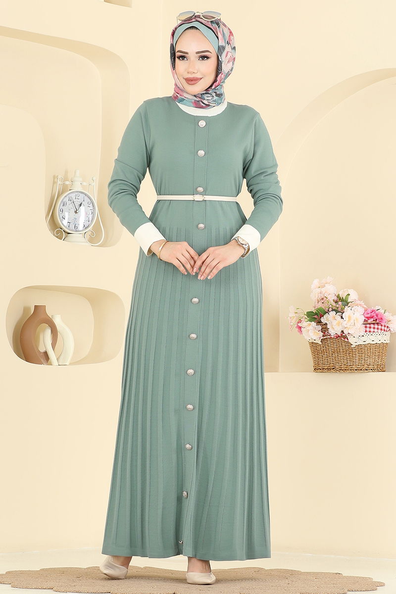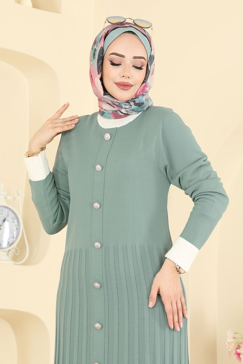 The Ribbed Detail Knit Dress is designed to keep you warm during the autumn and winter months. Its soft knit fabric offers a comfortable and stylish wear. Featuring a crew neck and decorative buttons, it presents a modern look while being lightweight and comfortable due to its unlined structure. It can be washed at 30 degrees on a gentle cycle. Suitable for modest attire, this standard-sized model is an elegant addition to any wardrobe.