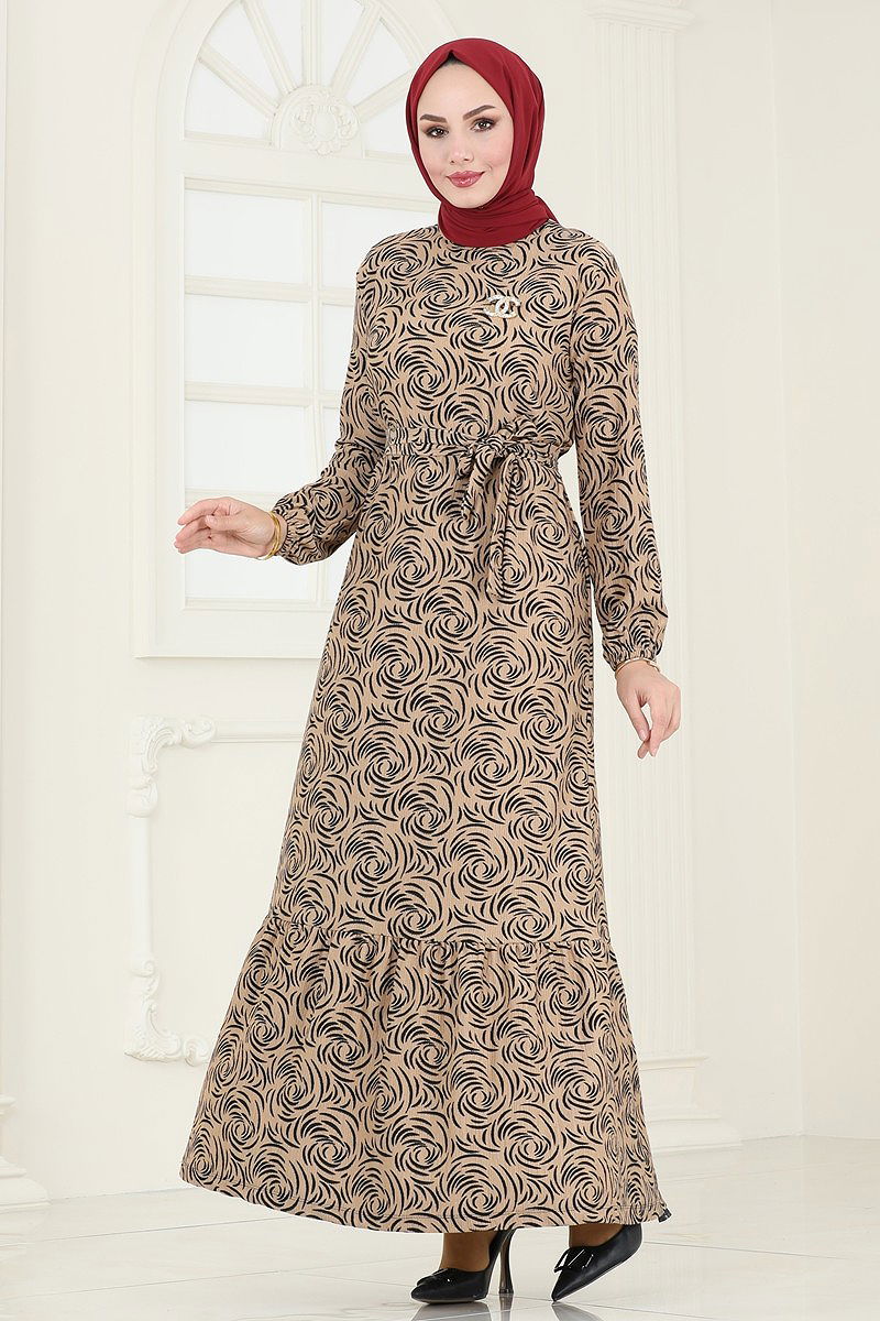 Patterned Belted Dress is a modest fashion item. It is suitable for the Autumn and Winter seasons. It should be washed at 30 degrees without wringing. It is made of first-class Karen fabric. The product has a bicycle collar design and is unlined. The inner dress can be worn from the head. To prevent the belt from fluttering, the two ends are sewn, and the middle part is left empty (seamless). The belt is included with the product and can be optionally used.