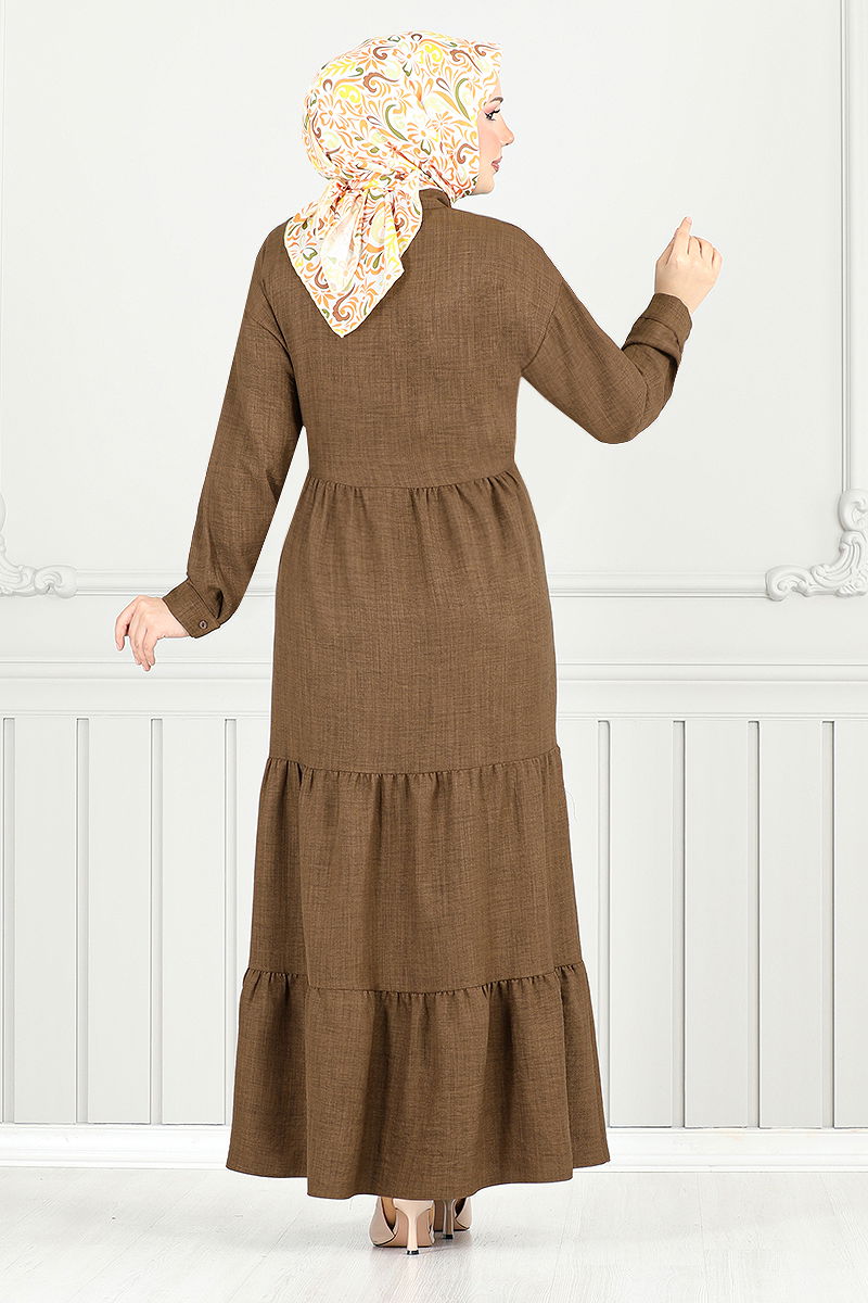 The Belted Dress, model, is a modest wear product suitable for all seasons. You can wash this product at 30 degrees without spinning, just as you would take care of your delicate garments. Made from Sofia Linen fabric, this elegant dress features a stand-up collar and half-button front, making it perfect for both everyday and special occasions. The unlined model offers a modern silhouette with a built-in belt. The product shown on the model is size 38.