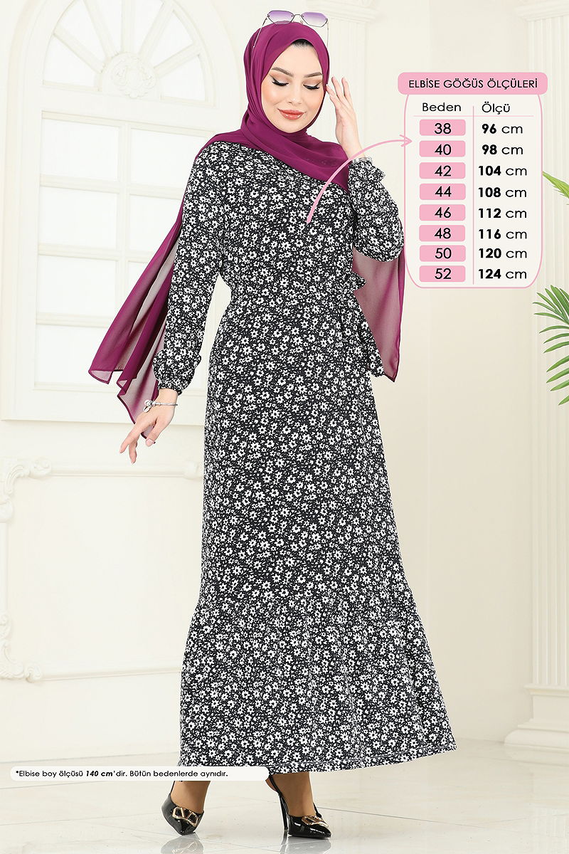 The Floral Pattern Crimp Dress is a chic modest wear suitable for all seasons. This dress, which can be washed at 30 degrees on a gentle cycle, is made from durable crimp fabric. It features a crew neck and a lining-free design for a modern look. The dress comes with an elastic cuff and includes a belt that can optionally be left unused. The length of the dress is 167 cm, with measurements of 90 cm chest, 70 cm waist, and 100 cm hips. This stylish and comfortable choice will make you stand out in any setting.