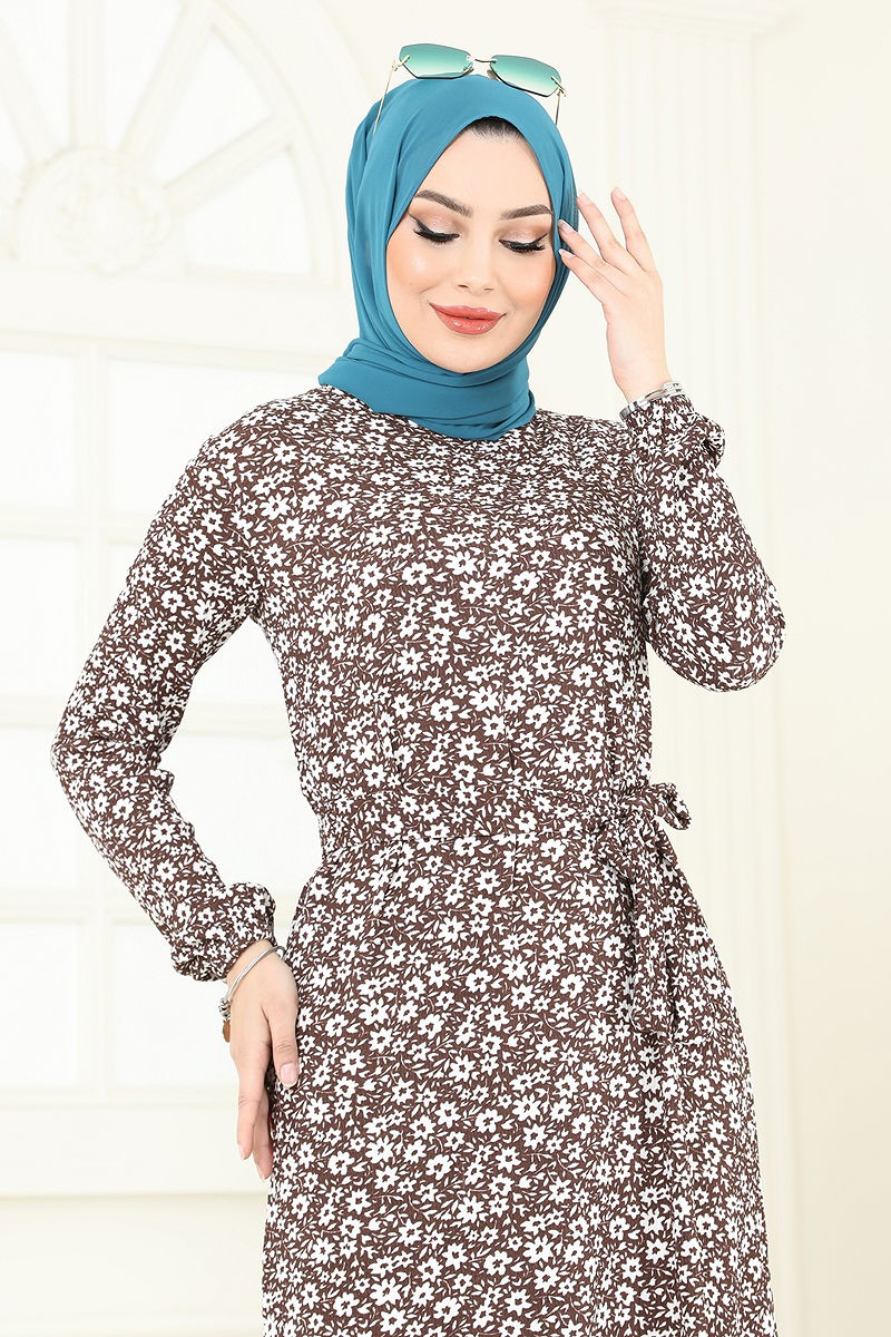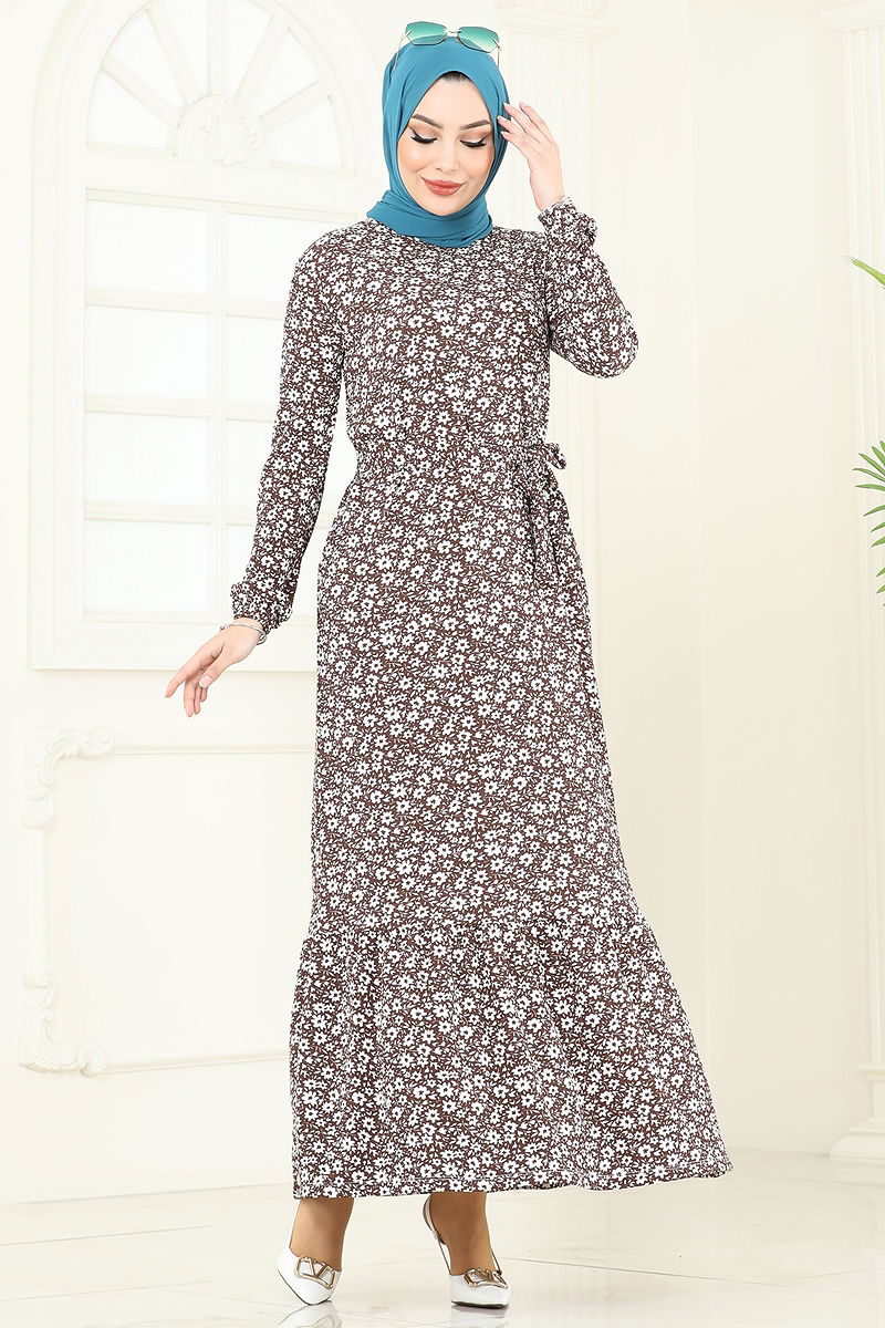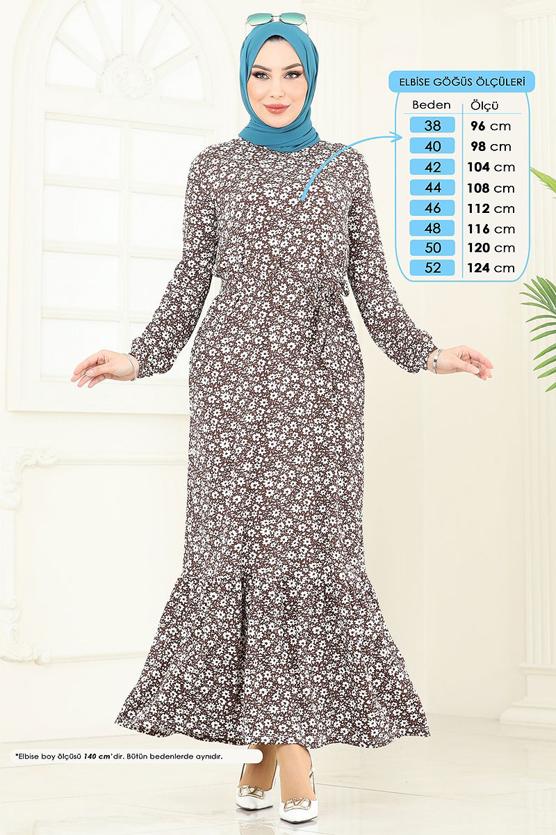 The Floral Pattern Crimp Dress is a chic modest wear suitable for all seasons. This dress, which can be washed at 30 degrees on a gentle cycle, is made from durable crimp fabric. It features a crew neck and a lining-free design for a modern look. The dress comes with an elastic cuff and includes a belt that can optionally be left unused. The length of the dress is 167 cm, with measurements of 90 cm chest, 70 cm waist, and 100 cm hips. This stylish and comfortable choice will make you stand out in any setting.
