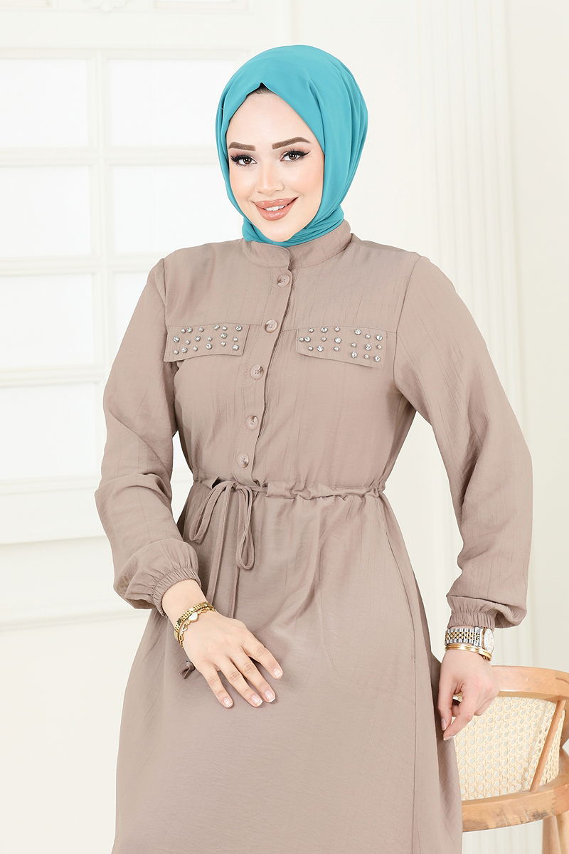 Featuring a chic and functional design, the Stone Detail Hijab Dress can be comfortably used in all seasons. It is washable at 30 degrees on a gentle cycle, and offers a modern look with its half mandarin collar and half button front details. The design is unlined and includes a faux pocket detail for an added touch of elegance, while the drawstring waist adapts to various body types. The product shown in the model is size 38-40.
