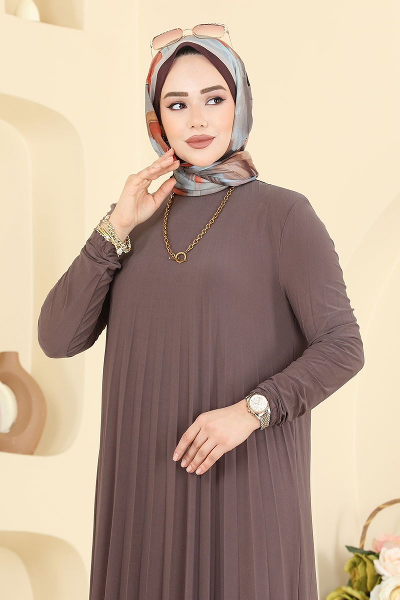Whether for everyday wear or special occasions, capture elegance with the Flowing Comfort Pleated Dress! Suitable for all seasons, this dress offers a perfect touch to your skin with its sandy fabric. Washable at 30 degrees with gentle care, this product combines comfort and style with its crew neck and elastic cuffs. The size 40 sample on the model ensures a design that fits all sizes!