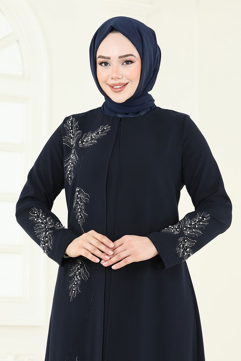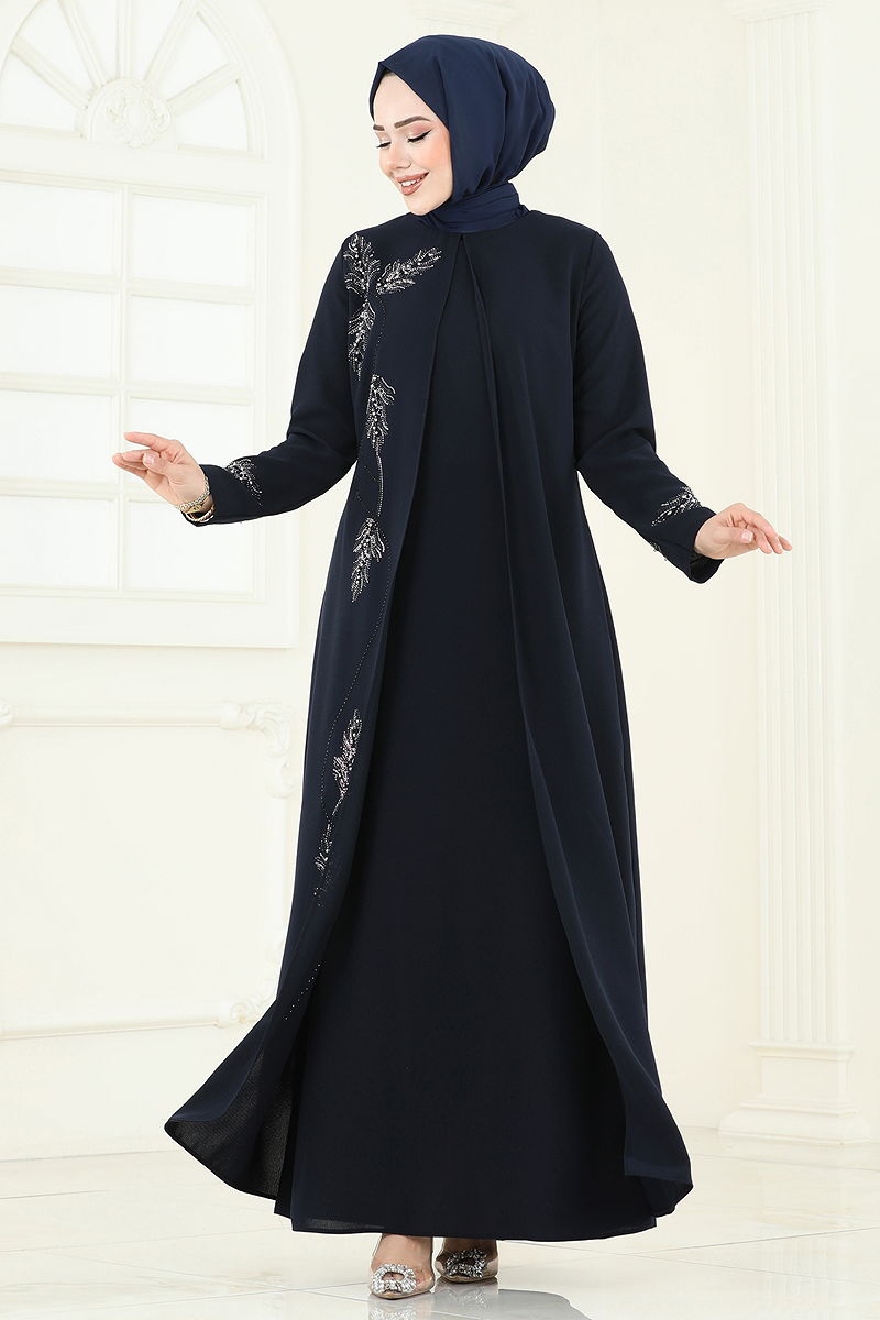 Featuring elegance and comfort, the Stone Detail Evening Dress can be worn in all seasons. This dress, which can be cleaned with a gentle wash at 30 degrees, is made from breathable honeycomb fabric. Designed to suit the taste of fashionable modest women, it has a crew neck and a liner-free design for a modern look. The back-zippered dress impresses with its sewn-in cardigan and studded pearl details. The product displayed is in size 44. Shine in every setting!
