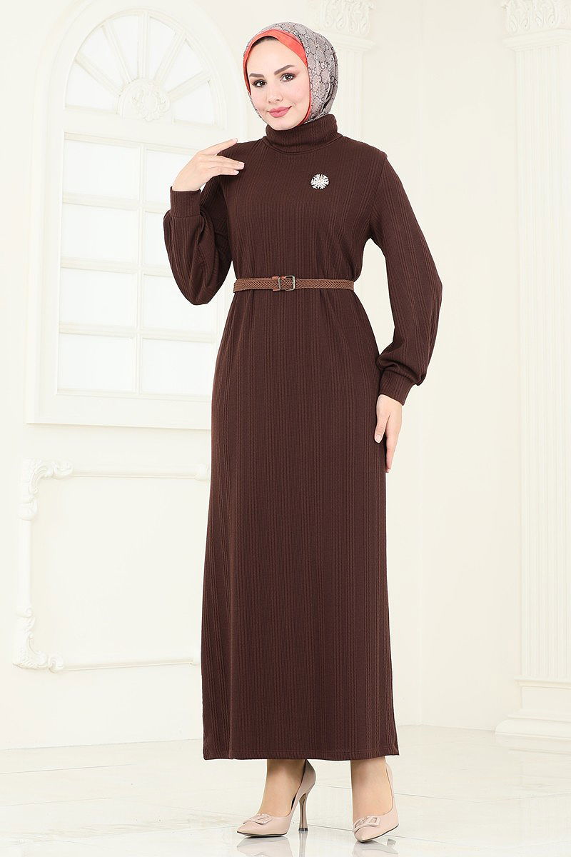 Straw Belted Hair Braided Dress is a model of hijab clothing. It can be used in the Autumn and Winter seasons. It can be washed at 30 DEGREES WITHOUT SQUEEZING. (DELICATE WASH) It is made of first-class Hair Braided fabric. The product has a high-neck design. It is unlined. (The product on the model is size 38.) The inner dress is worn over the head. Two ends of the belt are sewn to prevent wavering, and the middle part is left empty (seamless). The belt is included with the product and can be optionally used.