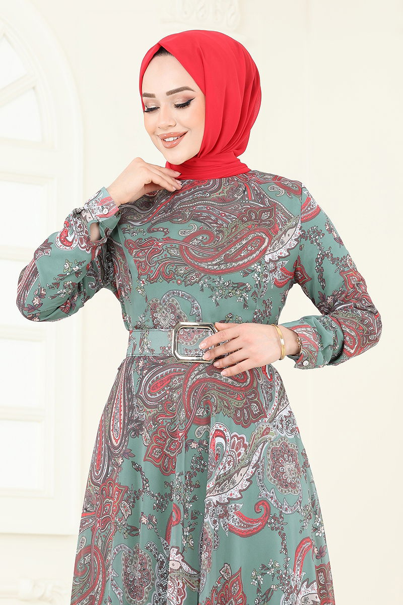 The Coated Belted Chiffon Dress is a stylish modest wear that can be comfortably worn across all seasons. It can be washed in a gentle cycle at 30 degrees Celsius. Made from chiffon fabric, this dress features a mandarin collar and is lined for added comfort. The side zipper makes it easy to wear, and it comes in a standard size 38. The belt is a significant detail that completes the elegance of the dress and can be optionally removed. It is tailored to prevent any waving at the ends while the center remains stitch-free. The cuffs are functional and add a stylish touch. The dress measurements include a length of 165 cm, a chest of 88 cm, a waist of 68 cm, hips of 99 cm, and a weight of 56 kg. This dress is suitable for special occasions or everyday wear, offering an elegant appearance.