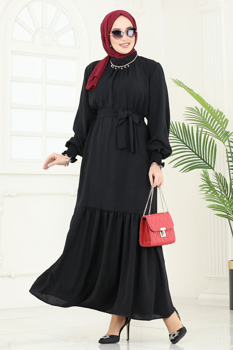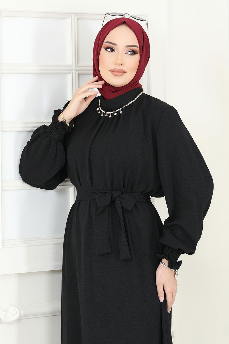 Ideal for either daily wear or special occasions, the Elastic Cuffed Hijab Dress ensures your comfort and style throughout all seasons. Recommended for gentle wash at 30 degrees, its aerobin fabric promises long-lasting use. Featuring a Mandarin collar and a back zipper, it offers practicality. Elastic cuffs enhance freedom of movement, while the included belt allows for a customizable style. Accessories are not included.