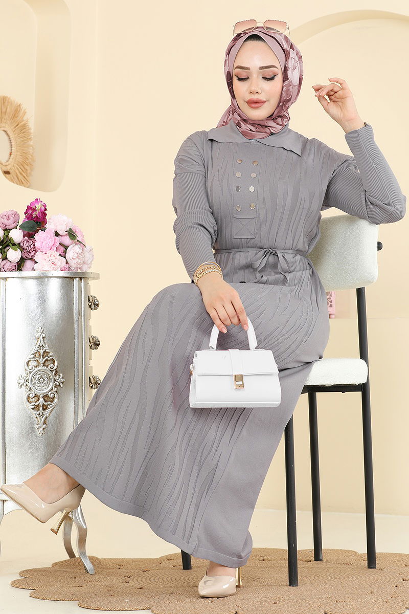 The Accessorized Buttoned Knit Dress is designed as a staple for autumn and winter. This dress, which can be cleaned with a 30-degree delicate wash, is made of knit fabric and features a shirt collar detail. The unlined model is suitable for standard sizes. The elegance of the dress is enhanced by decorative buttons and a belt, both adding aesthetic appeal and functional use. The belt is sewn at the ends, with the middle section left unstitched to prevent waves.