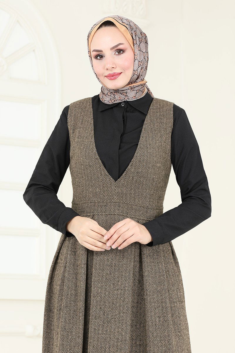V Neck Fishbone Pattern JILE model hijab product. It can be used in Autumn and Winter seasons. It can be washed without squeezing at 30 DEGREES. (GENTLE WASH) It is made of fishbone fabric. It is without lining. (The product on the model is size 38.) Height: 160 cm, Bust: 86 cm, Waist: 68 cm, Hips: 95 cm, Weight: 55 kg. Blouse is not included in the product. A sample combination with a blouse is made to show the intended use of the product.