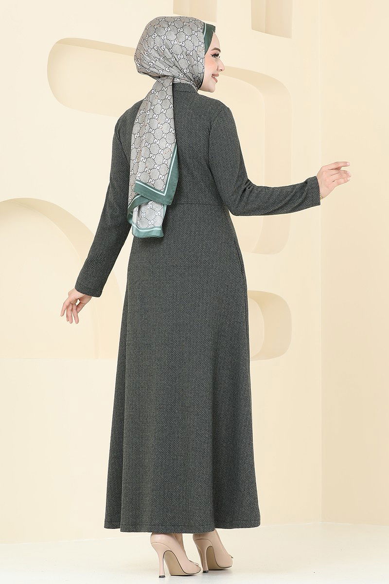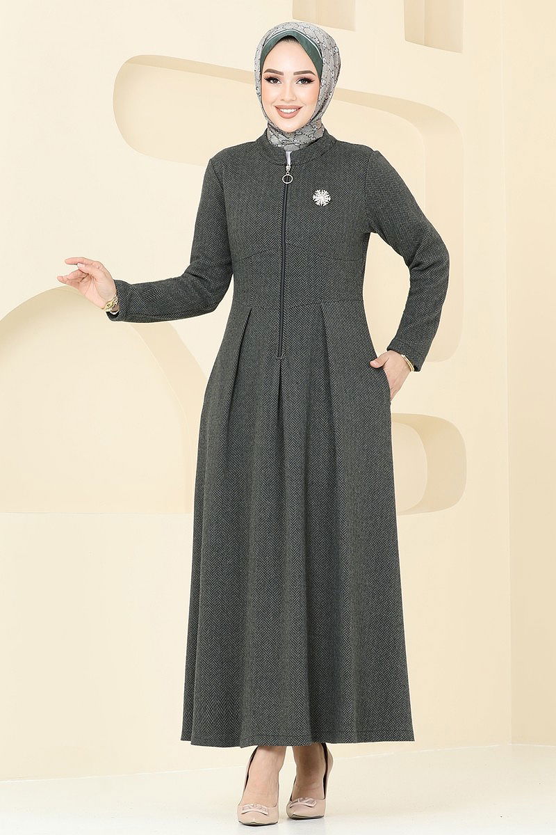 Half-Zip Herringbone Dress is a modest fashion product. Suitable for Autumn and Winter seasons. Can be washed at 30 DEGREES WITHOUT SQUEEZING. (DELICATE WASH) Made of herringbone fabric. The product has a Half Mandarin collar and is unlined. (The product on the model is size 38.) It has a front zip for use.