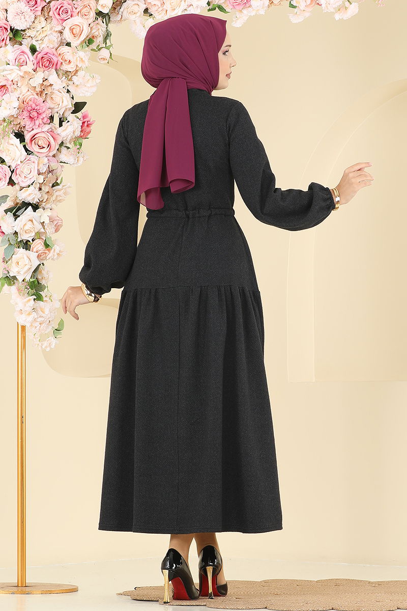 The Ruffle Detail Belted Tunic Dress is specially designed for modest fashion. Suitable for Autumn and Winter, this dress can be washed delicately at 30 degrees Celsius. Made from herringbone fabric, it features a semi-mandarin collar and is unlined. The dress has a back zipper and a belted waist for comfortable wear. Its elasticated cuffs and decorative buttons add a stylish touch. The product shown on the model is size 38.