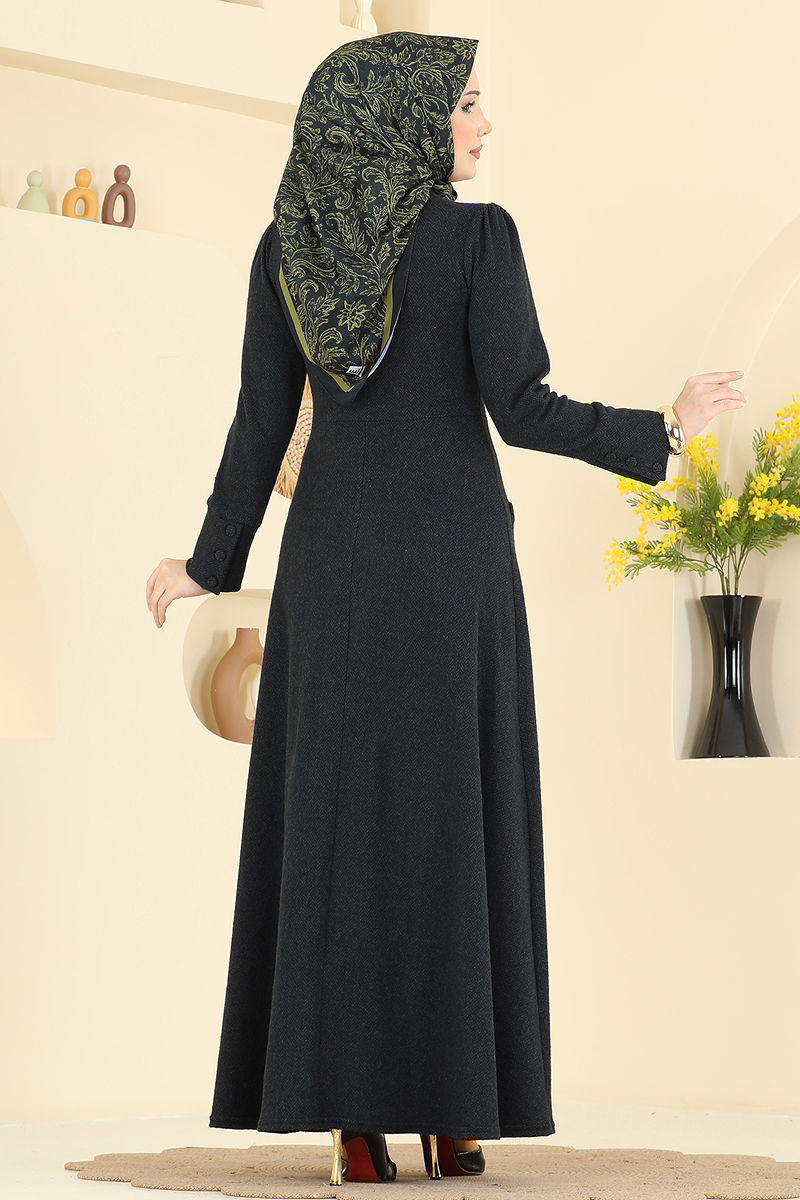 Embrace elegance during the autumn and winter seasons with the Herringbone Dress featuring pocket details. This modest fashion piece introduces a modern twist to your wardrobe. Crafted from quality herringbone fabric, this dress supports delicate washing at 30 degrees. The back zip closure and half mandarin collar ensure a comfortable fit, while the unlined design promises lightness. Complete with functional cuff buttons and stitched waist details, this dress is versatile enough for both daily wear and special occasions.