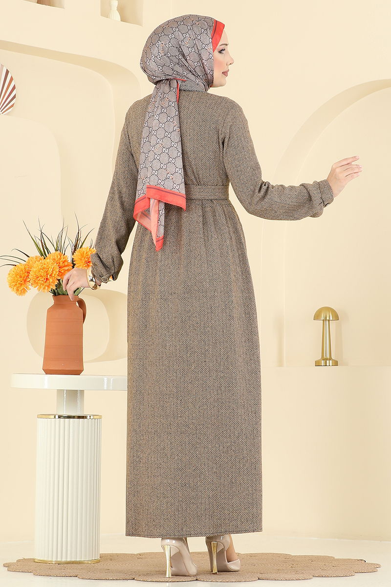 The Herringbone Dress with Shirt Collar is an elegant option suitable for modest fashion. Ideal for Autumn and Winter, this dress can be washed at 30 degrees with a gentle cycle. Made from unique herringbone fabric, this model offers a classic and chic look with its shirt collar design and buttons at the front. Its lining-free design provides a light and comfortable fit. The dress is sized at 38 and ensures a comfortable fit with an elastic waistband. The specially sewn belt, designed to prevent waviness, can be optionally removed or used. Active cuff buttons enhance the attention to detail.