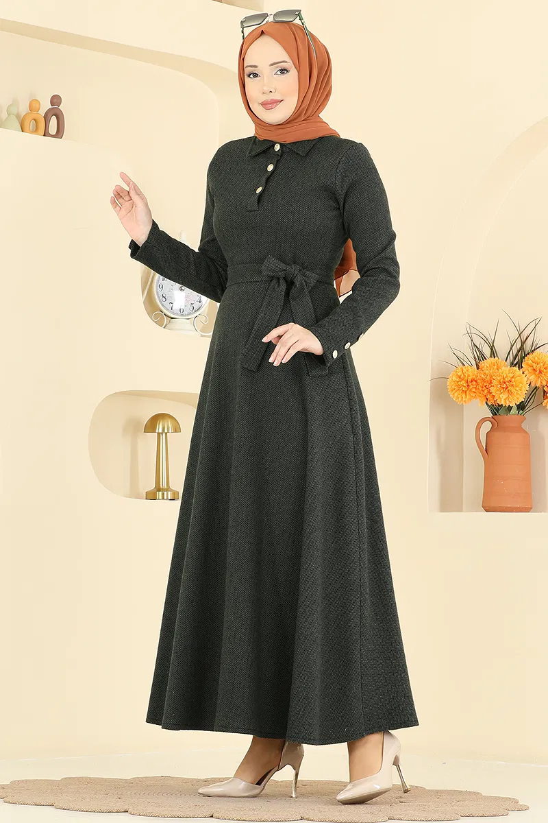 Featuring a sash detail and shirt collar, this herringbone dress is an ideal choice for those who prefer modest clothing. Suitable for all seasons, this piece can be delicately washed at 30 degrees. Its unique texture and elegant design will become an essential part of your wardrobe. The dress features a half-button front and a belted waist design for functional use. Complete your elegance with active button cuffs. This dress captures your grace without the need for any belt loops.