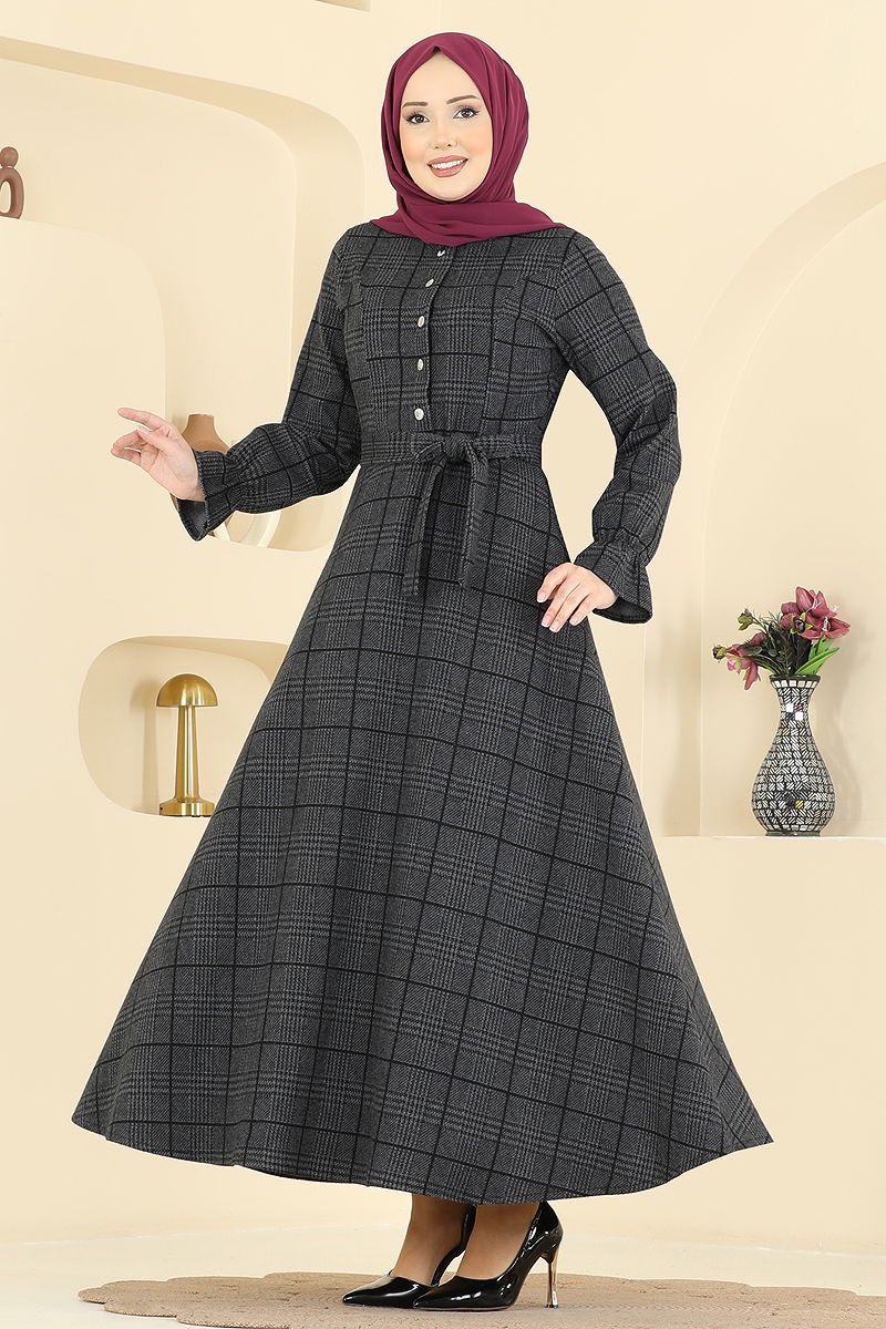This Belt Detailed Herringbone Dress combines elegance and comfort in a modest design, making it perfect for Fall and Winter. It can be easily washed at 30 degrees on a gentle cycle. The dress features a bicycle neckline and half-button front, adding a modern touch, while the ruffled skirt enhances its feminine allure. The dress is unlined and has elastic cuffs. The belt is an optional accessory that enhances the dress's elegance, providing flexibility in how you style it.
