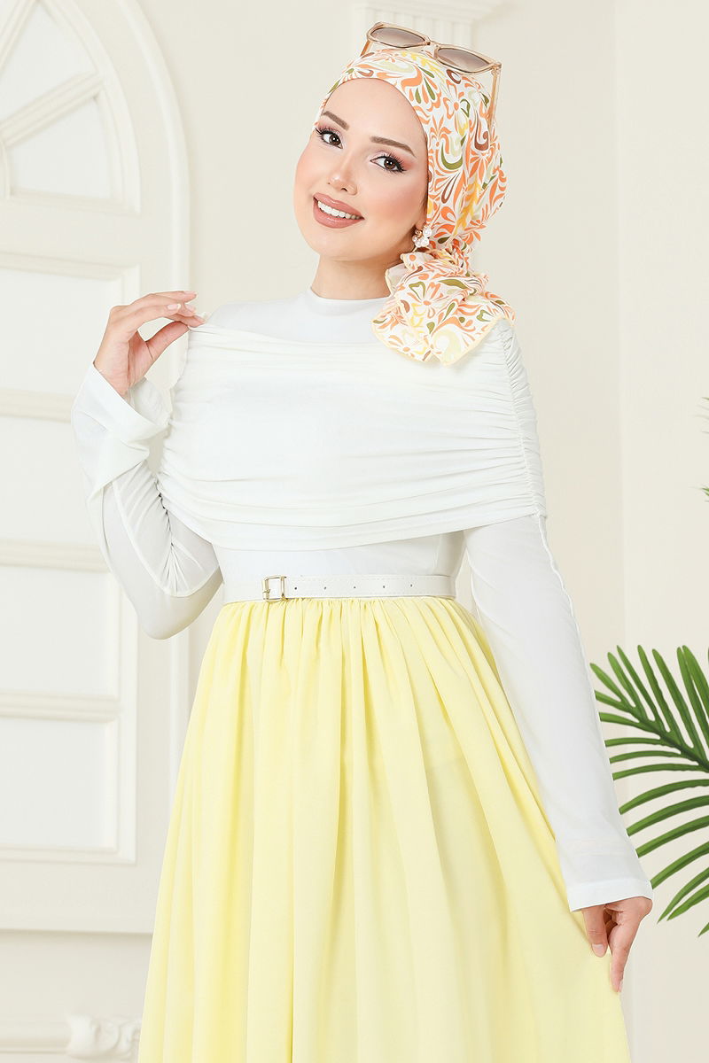 The Drapeli Sandy Dress is a modern and stylish choice. This modest dress can be comfortably worn in all seasons, offering comfort with its delicate fabric. Recommended to wash delicately at 30 degrees. Features a semi-mandarin collar and an unlined design making it light and practical. Dimensions: Length: 165 cm, Chest: 80 cm, Waist: 68 cm, Hips: 96 cm, Weight: 54 kg. The belt detail is removable and can be worn by slipping over the head. Sandy fabric provides both durability and a stylish appearance.