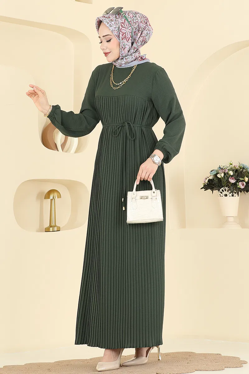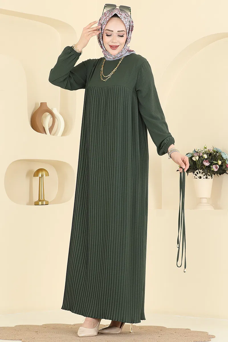 This elegant Pleated Detail Aerobin Dress is perfect for all-season wear. Made from lightweight and breathable aerobin fabric, this modest dress ensures you stay stylish in any setting. Easily maintained with a gentle wash at 30 degrees, the dress stands out for its practicality. Featuring a crew neck and elastic cuffs for a modern touch, its unlined structure ensures comfort throughout the day. With a back button for easy wear and an adjustable drawstring for versatile styling, this piece is a must-have.