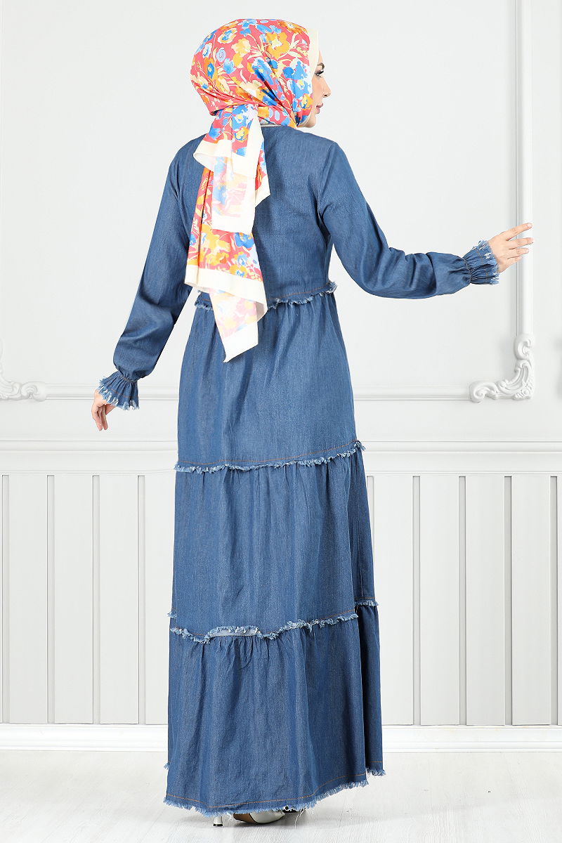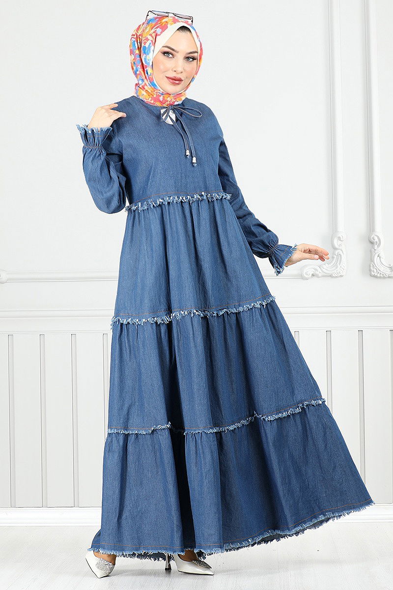This tassel-detailed denim dress adheres to modest fashion standards and is suitable for all seasons. This piece, manufactured from a high-quality blend of Tencel and denim fabric, can be gently washed at 30 degrees Celsius. It features a V-neck design without lining. The dress is slipped on over the head and has elasticated cuffs, with all details carefully sewn. The item displayed on the model is a size 38, making it a distinctive choice for your style.