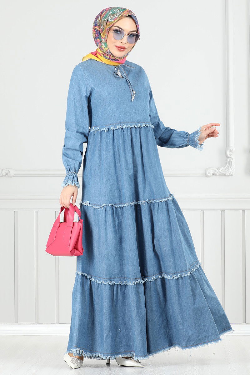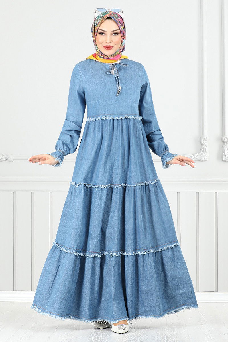 This tassel-detailed denim dress adheres to modest fashion standards and is suitable for all seasons. This piece, manufactured from a high-quality blend of Tencel and denim fabric, can be gently washed at 30 degrees Celsius. It features a V-neck design without lining. The dress is slipped on over the head and has elasticated cuffs, with all details carefully sewn. The item displayed on the model is a size 38, making it a distinctive choice for your style.