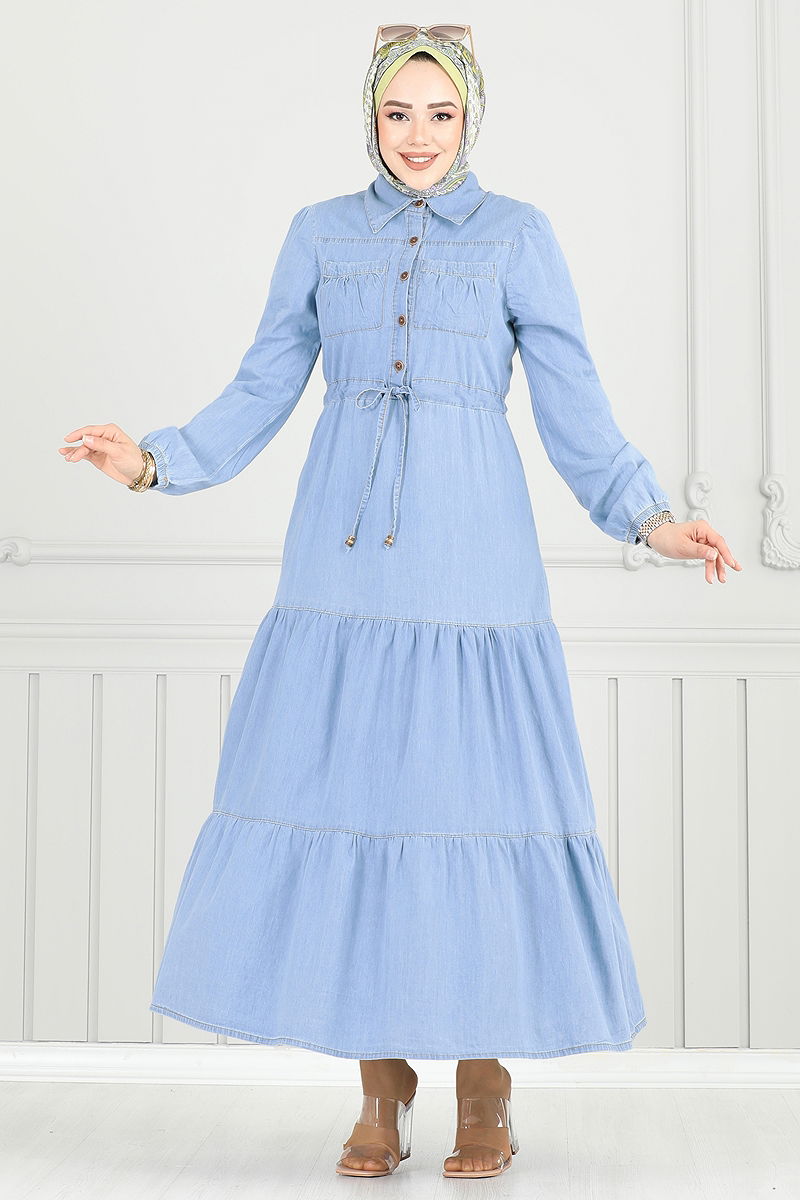 The Belted Tunnel Denim Dress is designed for modest wear and can be comfortably worn in all four seasons. This dress, which can be washed at 30 degrees on a gentle cycle, is made of durable denim fabric. It features a shirt collar design and a half-button front for practical use. The dress is unlined, with a drawstring waist and elasticated cuffs. The product shown in the image is size 38.