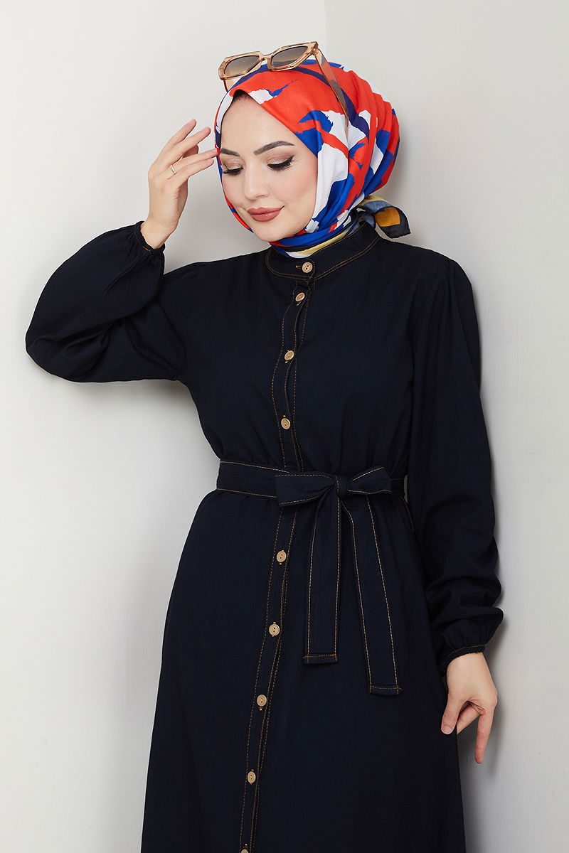 The Elastic-Cuffed Denim Dress is a versatile Hijab-friendly model suitable for all-season use. Made from 100% denim, this elegant dress is suitable for delicate washing at 30 degrees. It features a stand-up collar and front button details. The lining-free design ensures it is lightweight and functional. The dress is completed with elastic cuffs and an optional belt. The belt can be used or removed as desired. Complete your daily outfits effortlessly with this chic and practical denim dress.