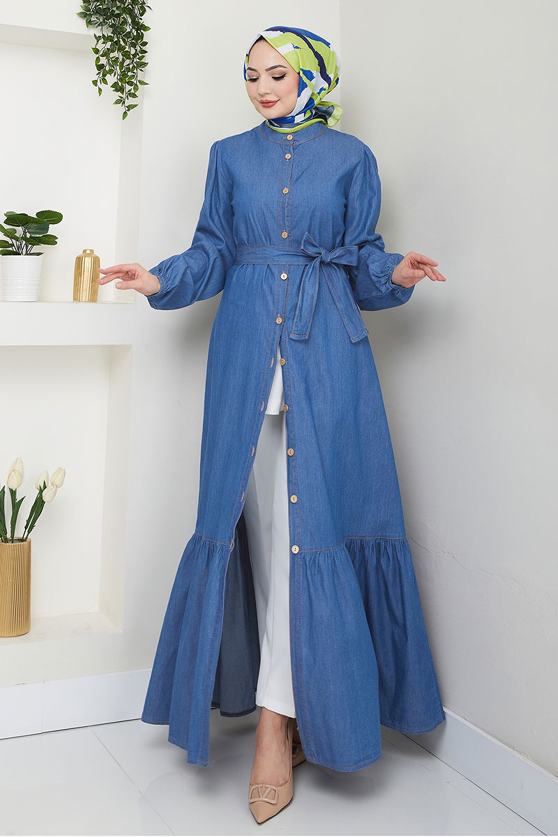 The Elastic-Cuffed Denim Dress is a versatile Hijab-friendly model suitable for all-season use. Made from 100% denim, this elegant dress is suitable for delicate washing at 30 degrees. It features a stand-up collar and front button details. The lining-free design ensures it is lightweight and functional. The dress is completed with elastic cuffs and an optional belt. The belt can be used or removed as desired. Complete your daily outfits effortlessly with this chic and practical denim dress.