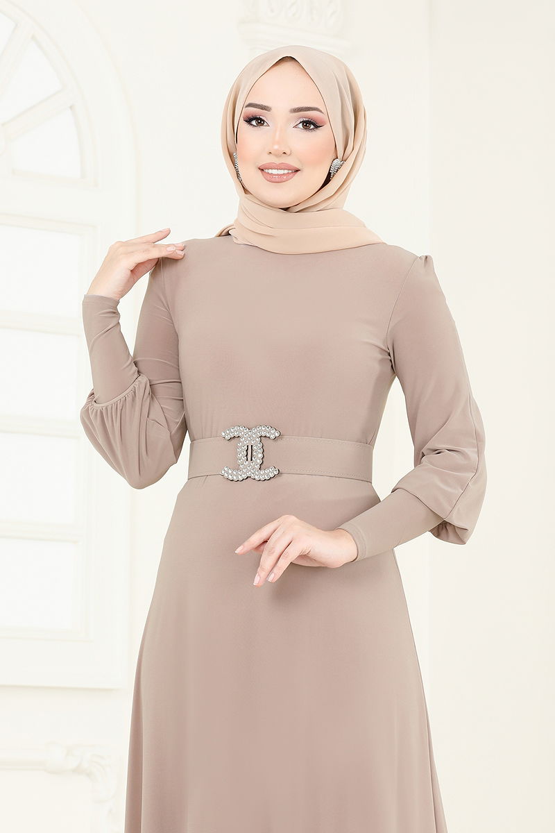 The Jeweled Belt Modest Dress is a special design that can be comfortably worn in all seasons. This dress, which can be cleaned with a delicate wash at 30 degrees, is made from sandy fabric. It features a high collar design and is unlined for comfort. The dress is distinguished by adhesive jewel details, and the belt ends are stitched to prevent fluttering. The belt comes with the dress but can be optionally used. Its elegant balloon sleeves make it stand out in any setting, ensuring a chic and refined appearance.