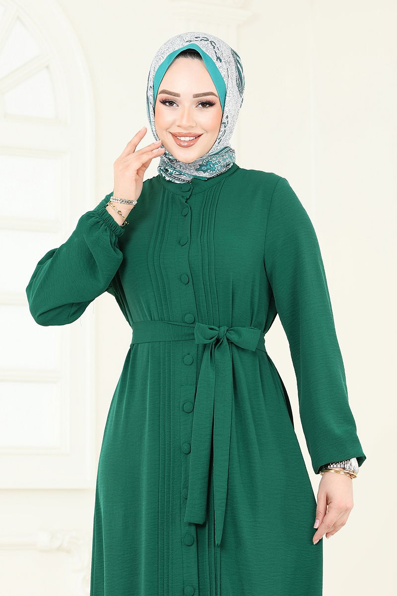 المنتج لديه ياقة نصف بيضوية. المنتج به أزرار من الأمام. غير مبطنة. الحزام متضمن، ،يمكن استخدامها حسب الرغبة السوار مطاطي. قد يكون هناك اختلاف في الدرجة اللونية في المنتج بسبب التقاط الصور الفوتوغرافية.