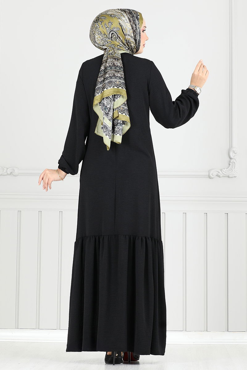 Dazzle in this stone detailed dress, a chic addition to modest fashion. Made from Aerobin fabric, this dress can comfortably be used across all four seasons. Recommended for gentle washing at 30 degrees, it is easy to care for. Featuring a crew neck and unlined design, it offers a contemporary look while the button at the back and the side-tie belt enhance its elegance. Elastic cuffs add to the comfort, while the stone details bring a touch of sophistication. The sewn-in belt adds functionality. Available in size 38, this model also comes in various sizes.