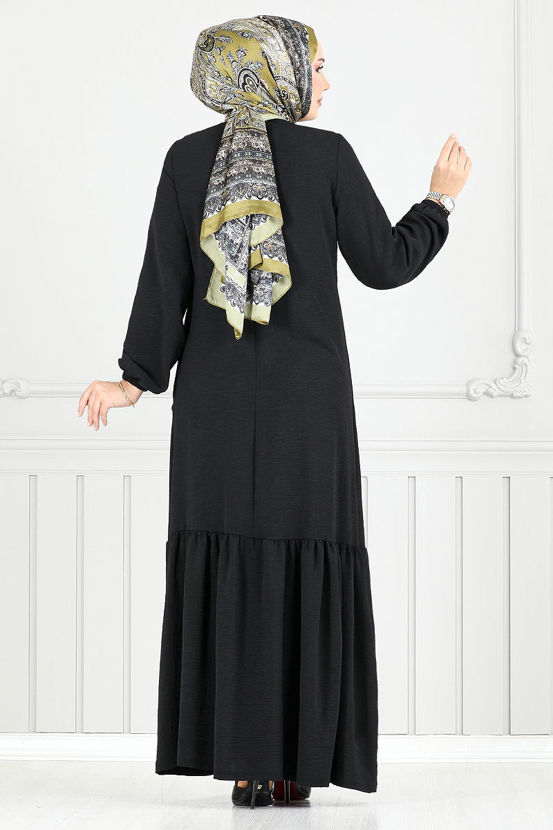 The Side-Tie Dress is specifically designed for those who prefer modest clothing. Suitable for all seasons, this dress is made from aerobin fabric, making it both lightweight and durable. It can be cleaned with gentle washing at 30 degrees Celsius, offering practicality in maintenance. The side-tie design and bike-style neck provide a modern look. The built-in belt and elegant stone details create an eye-catching style. The elastic cuffs ensure comfortable wearing. Displayed in size 38, the dress maintains its lightness with an unlined structure.