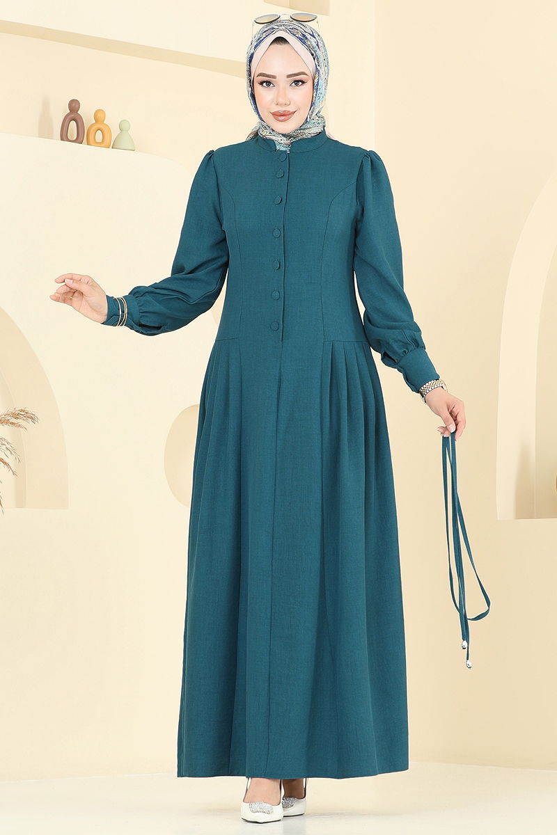 The Half-Buttoned Sofia Dress is a specially designed modest wear suitable for all seasons. Made from linen fabric, this dress should be washed at 30 degrees on a gentle cycle. It features a semi-mandarin collar and a front half-button design that offers a modern and stylish look. The unlined structure makes it lightweight and comfortable. The included belt is carefully stitched to prevent waving and its use is optional. Active cuff buttons add functionality.