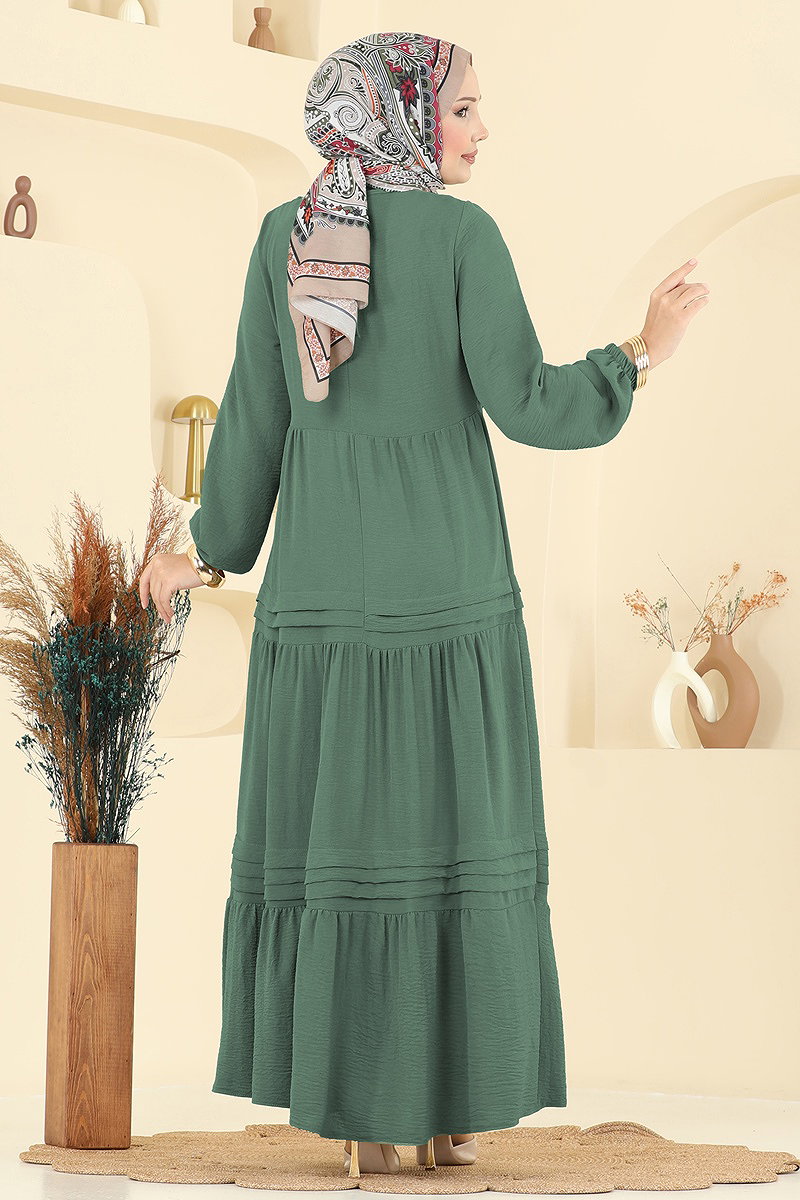 Featuring a tiered and elegant design, the Aerobin Dress is comfortable to wear in all seasons. Made from Aerobin fabric, it is lightweight and breathable, ensuring comfort throughout the day. The dress is designed for modesty with a bicycle neckline and elastic cuff details, presenting a modern look. It's unlined for a light and comfortable wear, and can be washed at 30 degrees on a gentle cycle. It also features a button at the back for easy wear.