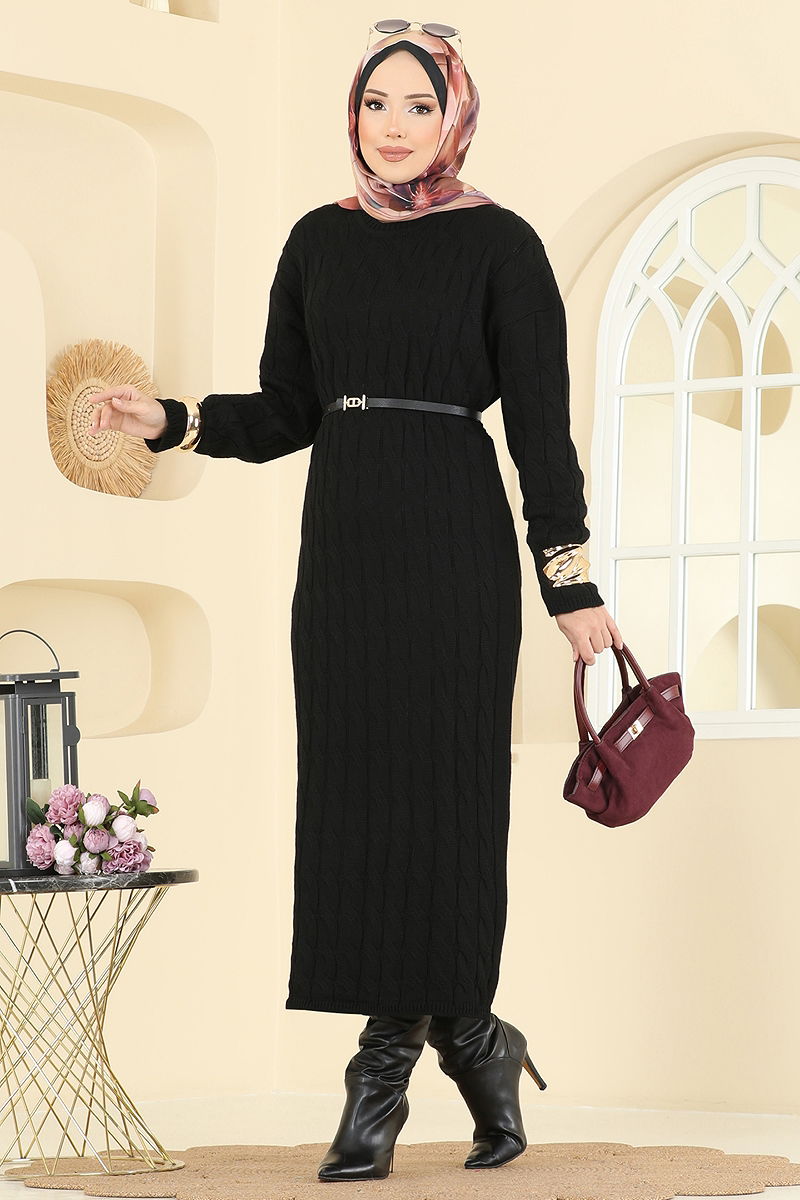 The Twisted Pattern Knit Dress is a modest dress suitable for autumn and winter seasons. It can be washed at 30 degrees on a gentle cycle. Made from knit fabric, this item features a crew neck and is unlined. The product shown is in a standard size.