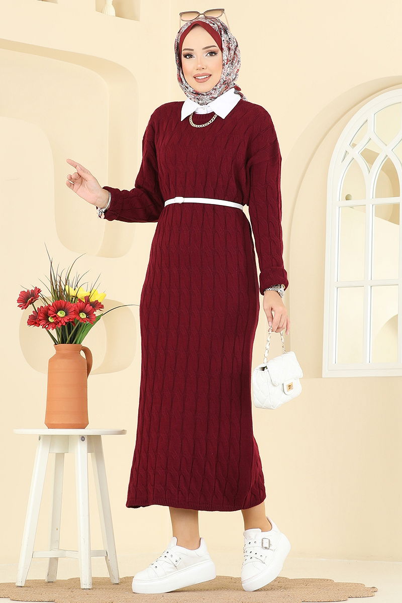 The Twisted Pattern Knit Dress is a modest dress suitable for autumn and winter seasons. It can be washed at 30 degrees on a gentle cycle. Made from knit fabric, this item features a crew neck and is unlined. The product shown is in a standard size.