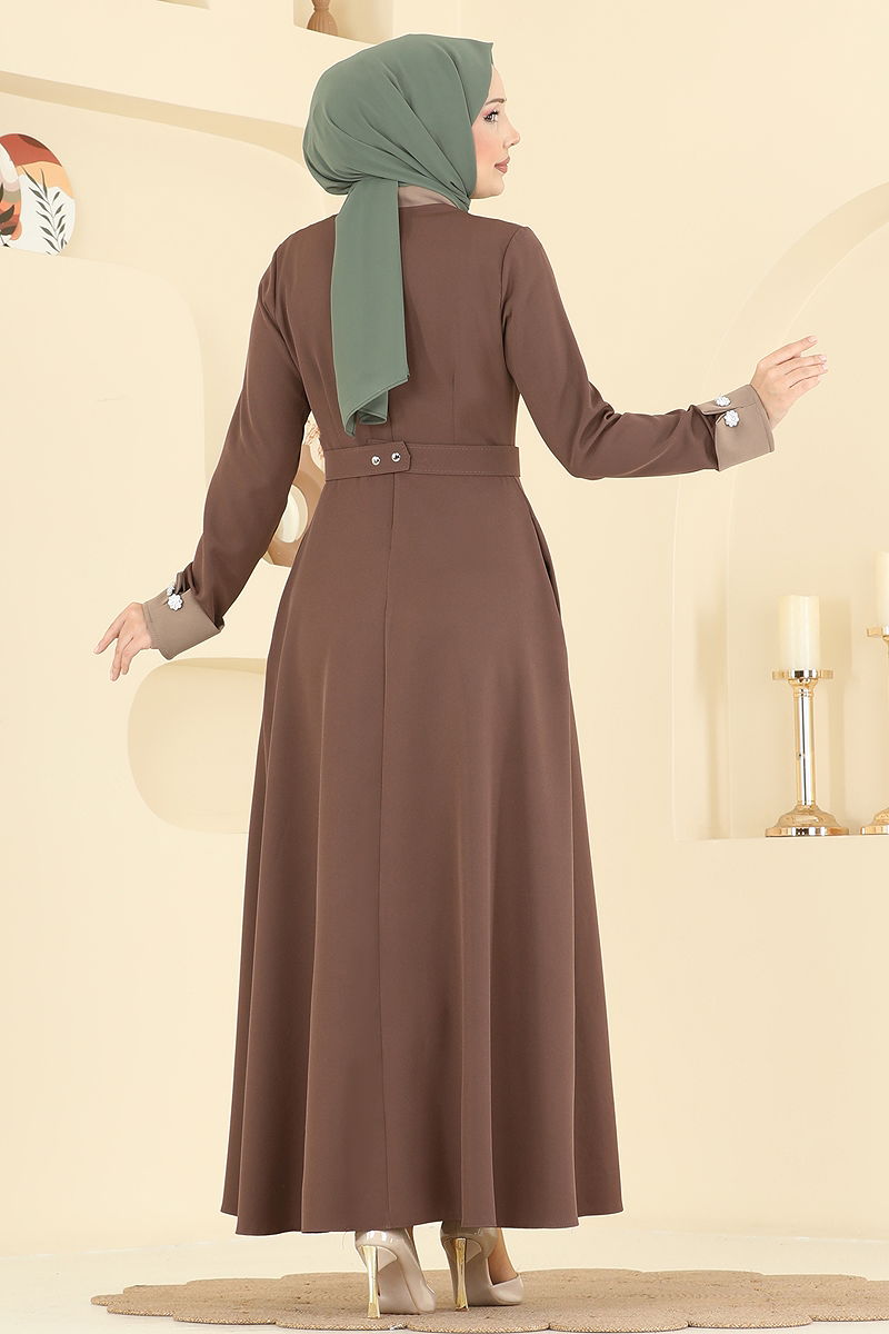 The Gem-Studded Dabıl Dress is a stylish hijab fashion piece suitable for all seasons. Washable at 30 degrees on a gentle cycle, this dress is made from durable Dabıl fabric. It features a scarf collar and is unlined for comfort, while the back zipper makes it easy to wear. Available in size 38 as displayed on the model. The included belt can be optionally removed; its ends are sewn while the middle is stitch-free. The dress also has pockets and decorative cufflinks for added practicality and style.