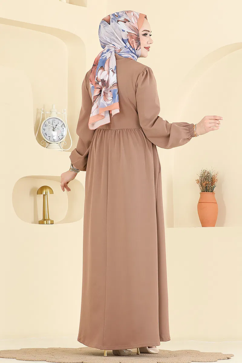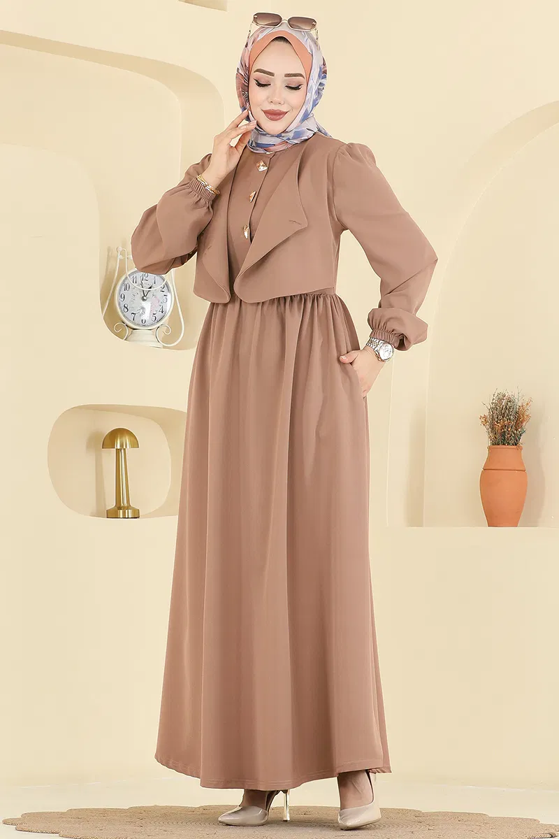 Asymmetrical Buttoned Dabil Dress is a stylish modest wear option that offers comfort in all seasons. This dress, notable for its delicate fabric, can be washed at 30 degrees, providing easy care and maintenance. It features a semi-mandarin collar and elastic cuffs for a modern and elegant appearance. Half-button details on the front and a stitched waist design beautifully wrap the body. The bolero detail adds extra flair, and practical pockets on the sides are included. An ideal choice for year-round comfort!
