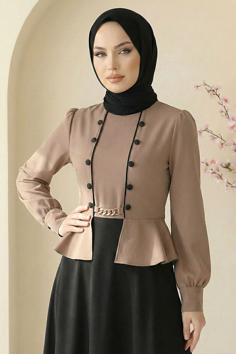 Offering both elegance and comfort, the Accessorized Buttoned Dabıl Dress is a hijab fashion item suitable for all seasons. This dress can be gently washed at 30 degrees and is made from durable Dabıl fabric. It features a bicycle neck design, adding a modern touch, and is practical with its lining-free structure and zipper at the back. The waist is stitched, and the cuff buttons are decorative accessories, standing out with an eye-catching detail. This unique design, combining functionality and aesthetics, is a must-have in every stylish woman's wardrobe.